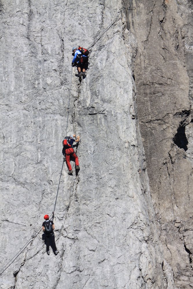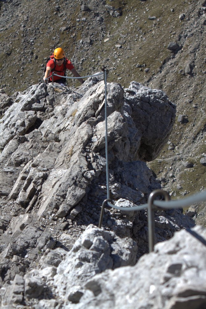 Teil 1: Vom Einstieg über einige knackige Stellen (B/C) einen Felspfeiler empor. Es folgt ein luftiger Steilanstieg (meist C, selten leichter) direkt an der Kante. Über einen flachen Grat (B) - dort kann man optional über eine 20 m lange Seilbrücke (A/B) gehen - wird die nächste Steilstufe (oft C) erreicht. Anspruchsvoll - ein kleiner Überhang (C/D) muss überwunden werden - geht es weiter zum Steigbuch. Ein flacher Grat (B) führt anschließend zu einer Scharte und einem kurzen Stück Gehgelände (gute Rastmöglichkeit). Es folgt ein kurzer Abstieg in eine Scharte.