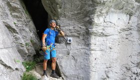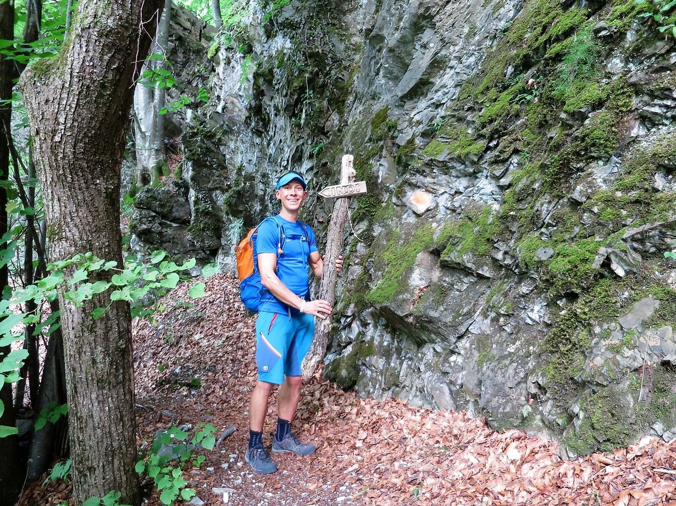 Siehe Topo! Im Mai 2024 wurde der erste Teil (bis zur Höhle) weiter nach rechts verlegt. Der Einstieg ist aber leicht zu finden. Auch der Ausstieg wurde angepasst und etwas verlängert. Dort führt die Route am Spreizschritt nach rechts an der Felswand entlang und durch ein Felsloch (am besten Rückwärts durch - mit Rucksack wird es eng) bis zum Ende der Route. Der Pfad zurück zum Wanderweg ist markiert.
