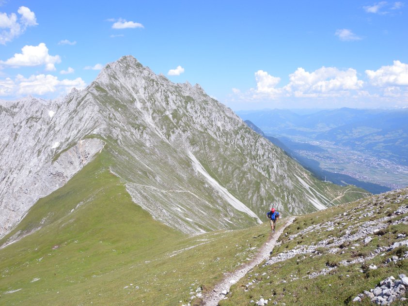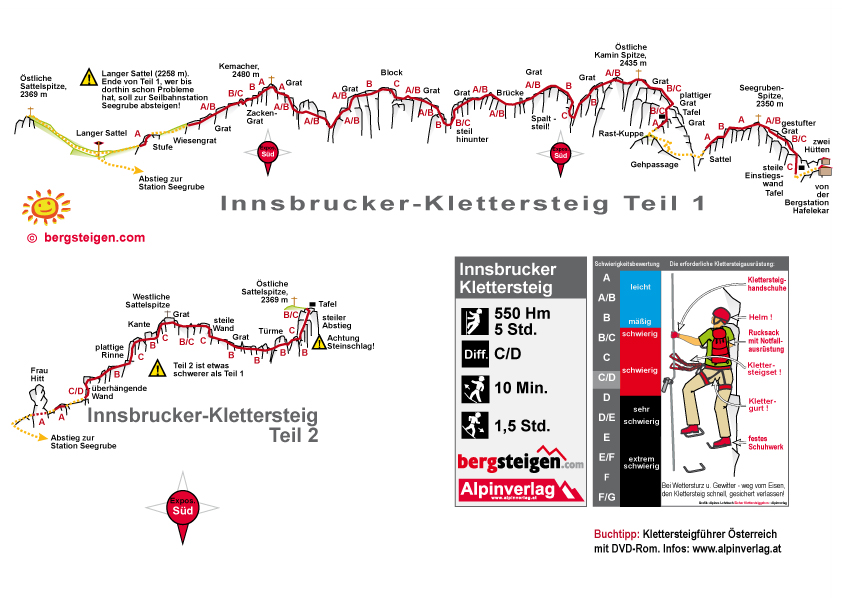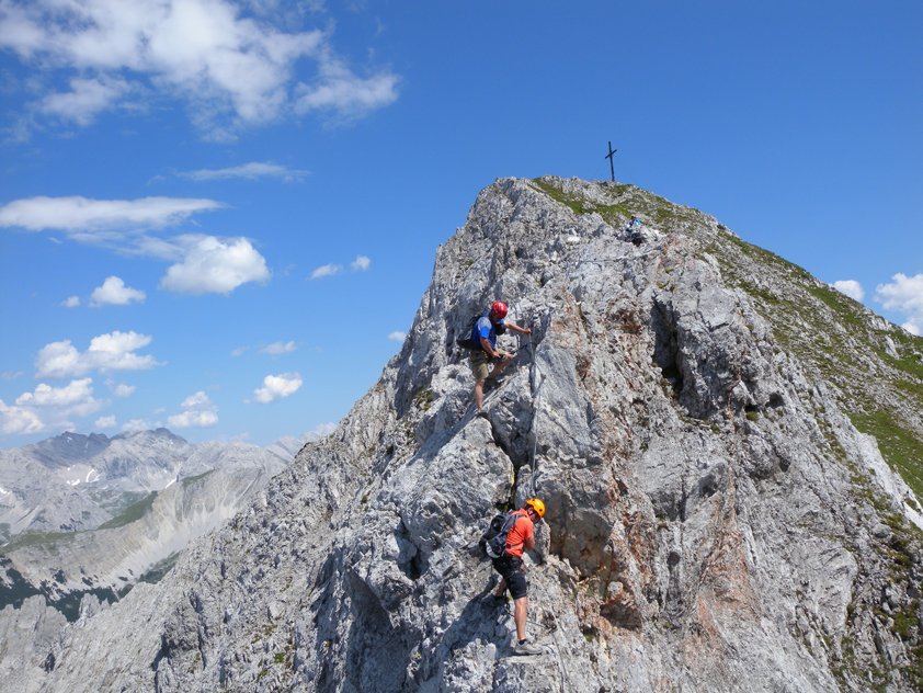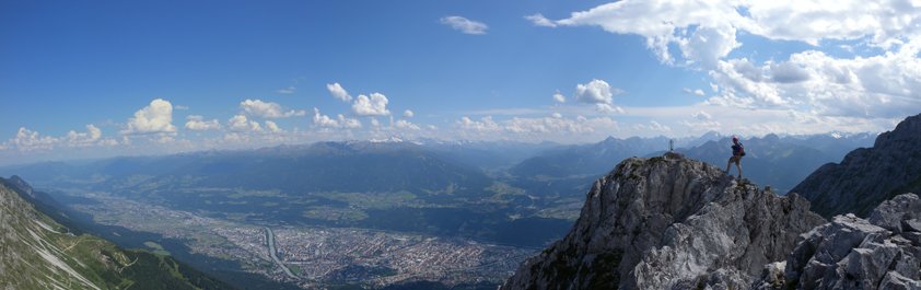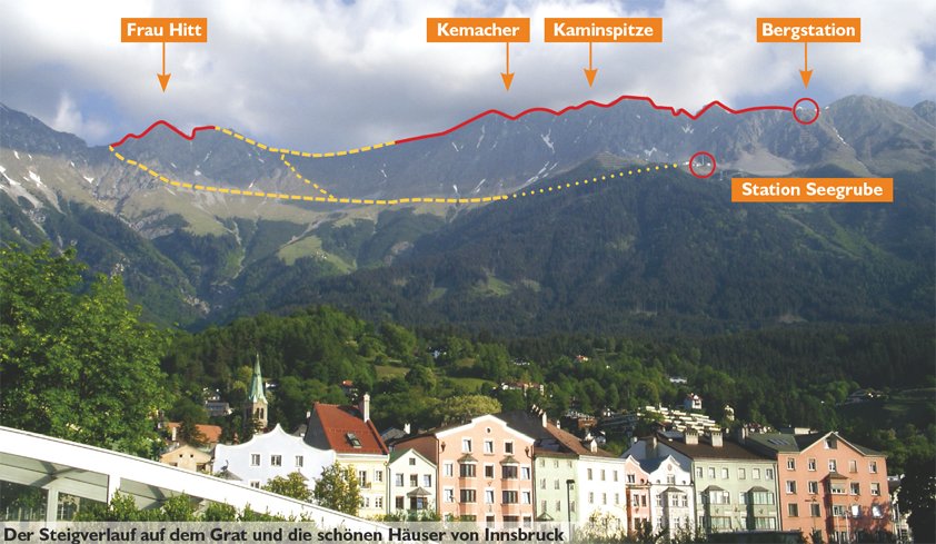 In zwei Teilen führt der Innsbrucker Klettersteig vom Hafelekar über den "Langen Sattel" zum Frau-Hitt-Sattel - wobei zahlreiche Gipfel bestiegen werden. Vor allem landschaftlich hat dieser Klettersteig viel zu bieten - neben grandiosen Blicken auf das fast 2000 Meter tiefer gelegene Innsbruck, kann man auch einen unglaublichen Fernblick auf die vergletscherten Berge des Alpenhauptkammes genießen. Klettertechnisch wartet dieser Klettersteig mit anspruchsvollen und originellen Passagen (Hängebrücke) auf. Abwechslung in der Routenführung ist garantiert, da der erste Teil hauptsächlich auf einem Grat entlang verläuft, der zweite Teil hingegen durch ein Labyrinth von Felstürmen, Scharten und sehr steilen Wandpassagen führt. Der Klettersteig ist ein Klassiker, den man gemacht haben sollte!
