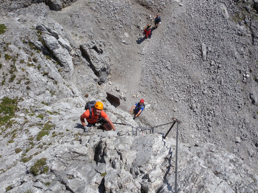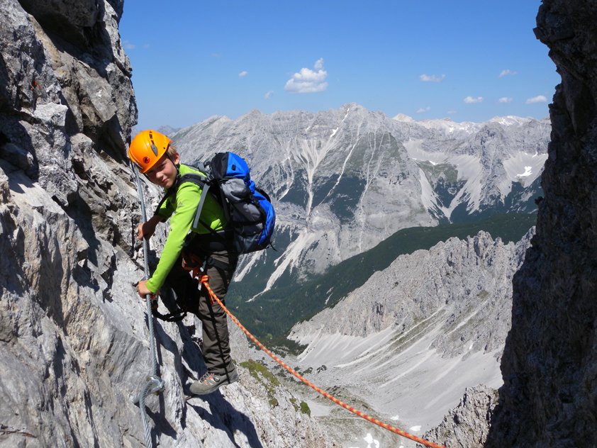 Komplette Klettersteigausrüstung und Helm, evtl. Klettersteighandschuhe. Für Anfänger und Kinder/Jugendliche ein Sicherungsseil.