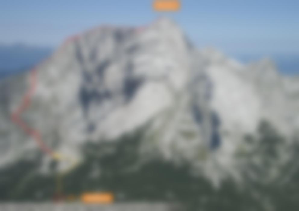 Über Bänder, Schrofen und kleine Wandstufen (A und 1) in ein Geröllfeld. Nach dem Geröll steil hinauf (bis B und 1) zu einem Band (A). Anschließend durch eine breite steile Rinne (A/B bis B, 1-) zum Gugelgrat. Kurz dem Grat folgen und in die linke Flanke. Auf ausgesetzten Bändern (A bis A/B) und später im Geröll (A bis A/B) zum Gipfel.