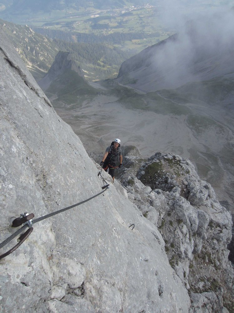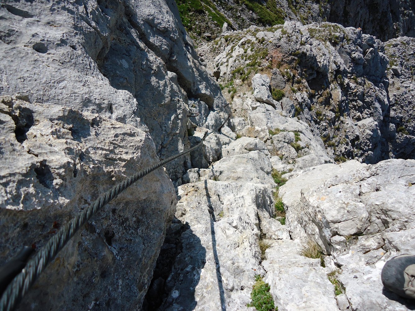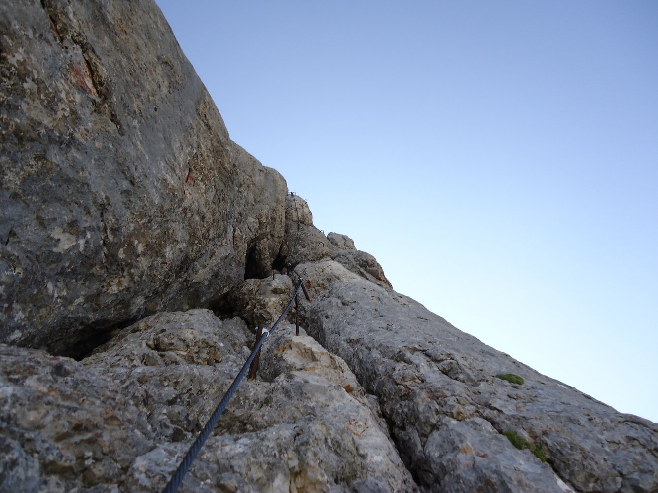 Kurzer, aber anstrengender Klettersteig, sehr ausgesetzte Passagen nahe der Vertikale, gesamt schwierig (C), eine Stelle sehr schwierig (D). Kinder und Anfänger sollten an ein Sicherungsseil genommen werden.