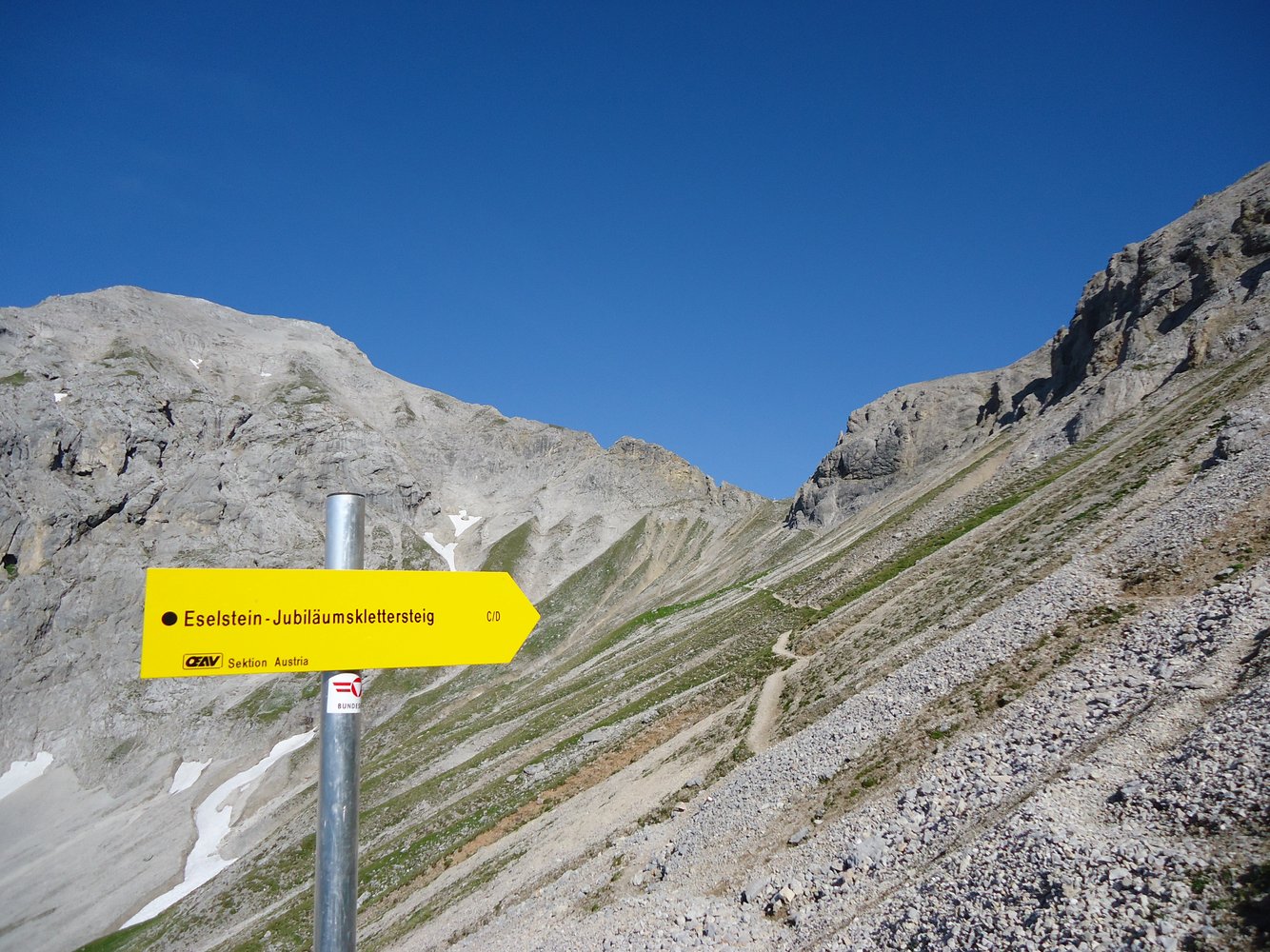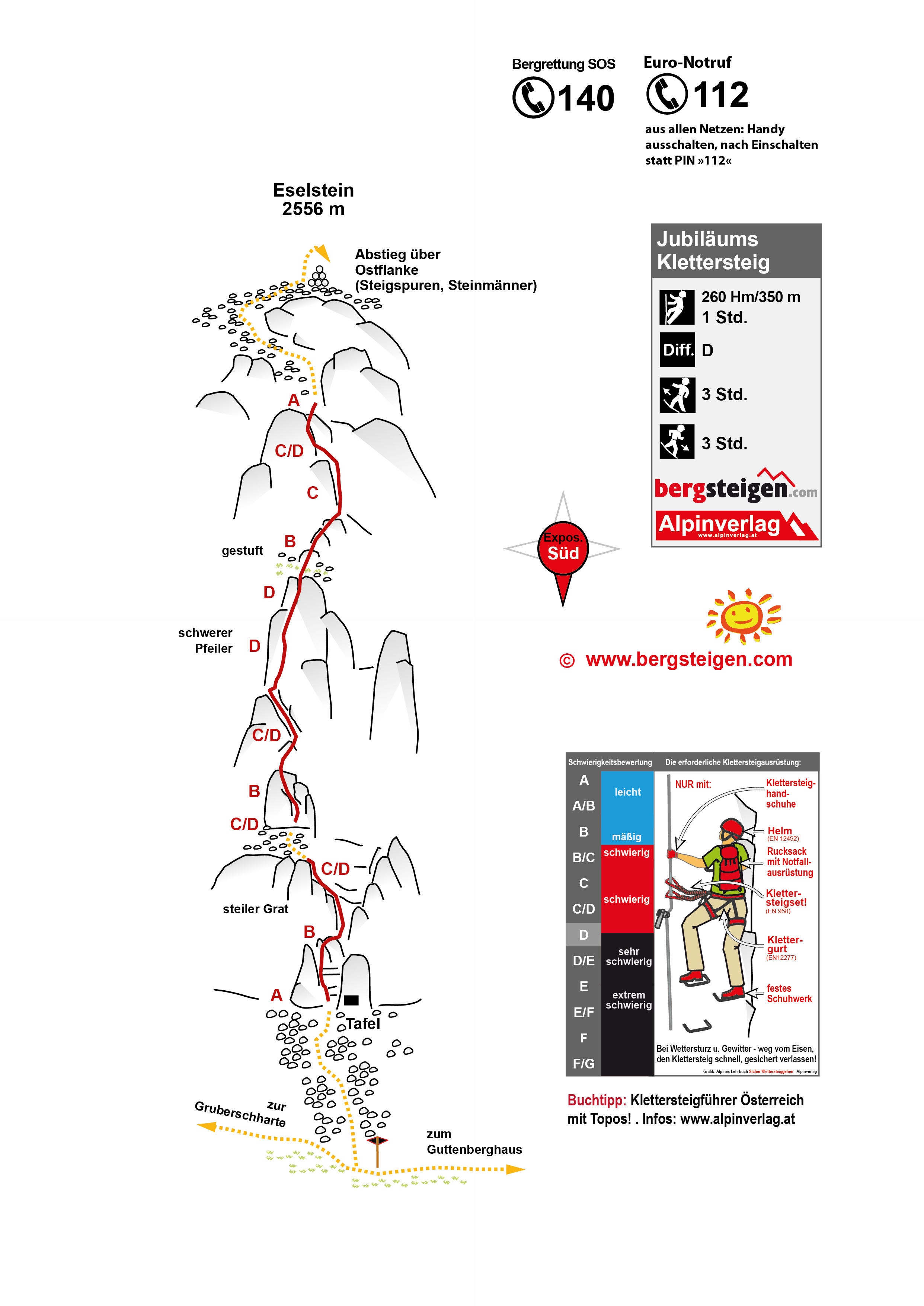 Dieser schöne Klettersteig im Nahbereich des Guttenberghauses stellt die perfekte Besteigungsmöglichkeit des Eselsteines dar. Der Klettersteig ist durchaus als anspruchsvoll zu bezeichnen, da das Drahtseil nicht durchgehend gespannt ist. Der kurze Zustieg von der Hütte und der problemlose Abstieg über die Ostflanke zeichnen diese Steiganlage aus.