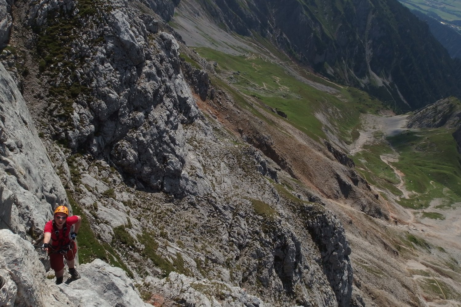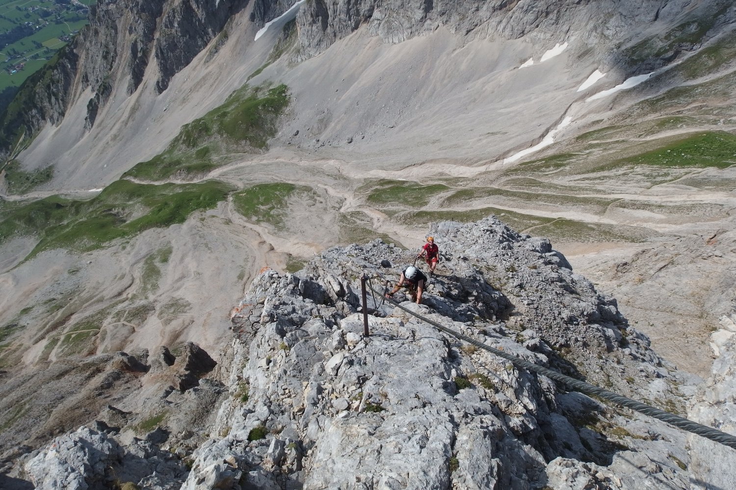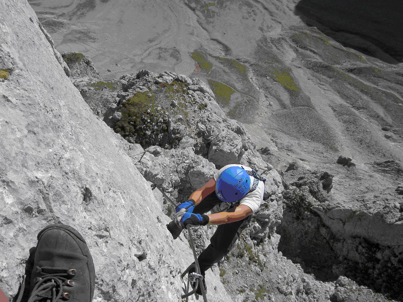 Komplette Klettersteigausrüstung - Kinder und Anfänger sollten in der 1991 errichteten Anlage unbedingt ans Seil genommen werden, im Einstiegsbereich herrscht Steinschlaggefahr = Helm.