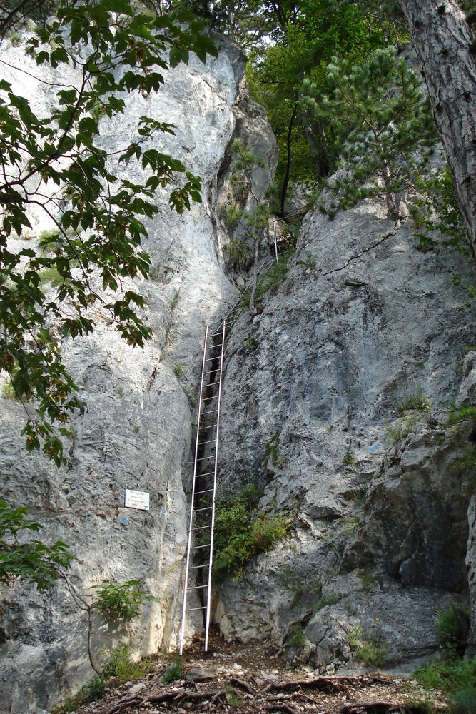 Dieser 1983 zum 80jährigen Jubiläum der Neunkirchner Naturfreunde errichtete Steig ist "luxuriös" ausgestattet: Alle Leitern und Seile sind aus Aluminium und die Versicherungen sind mehr als ausreichend. Vom Parkplatz auf gelb markiertem Wanderweg bis zu einer Tafel "Zu den Klettersteigen", dann folgt man den Schildern bis zum Beginn des Steiges. Grüne Markierungen leiten durch den Wald zur langen Einstiegsleiter. Zwei weitere Leitern folgen, dann helfen Seile über ein aussichtsreiches Felsband hinweg zum Ende der Versicherungen.