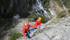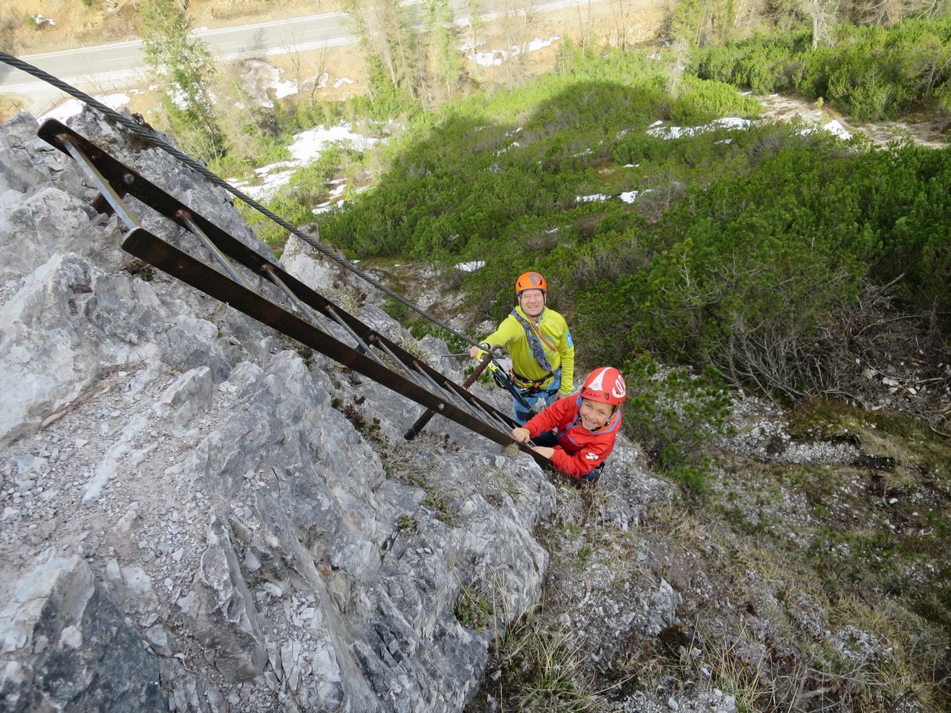 Komplette Klettersteigausrüstung und Helm, evtl. Klettersteighandschuhe. Für schwächere Klettersteiggeher und Kinder ein Sicherungsseil.