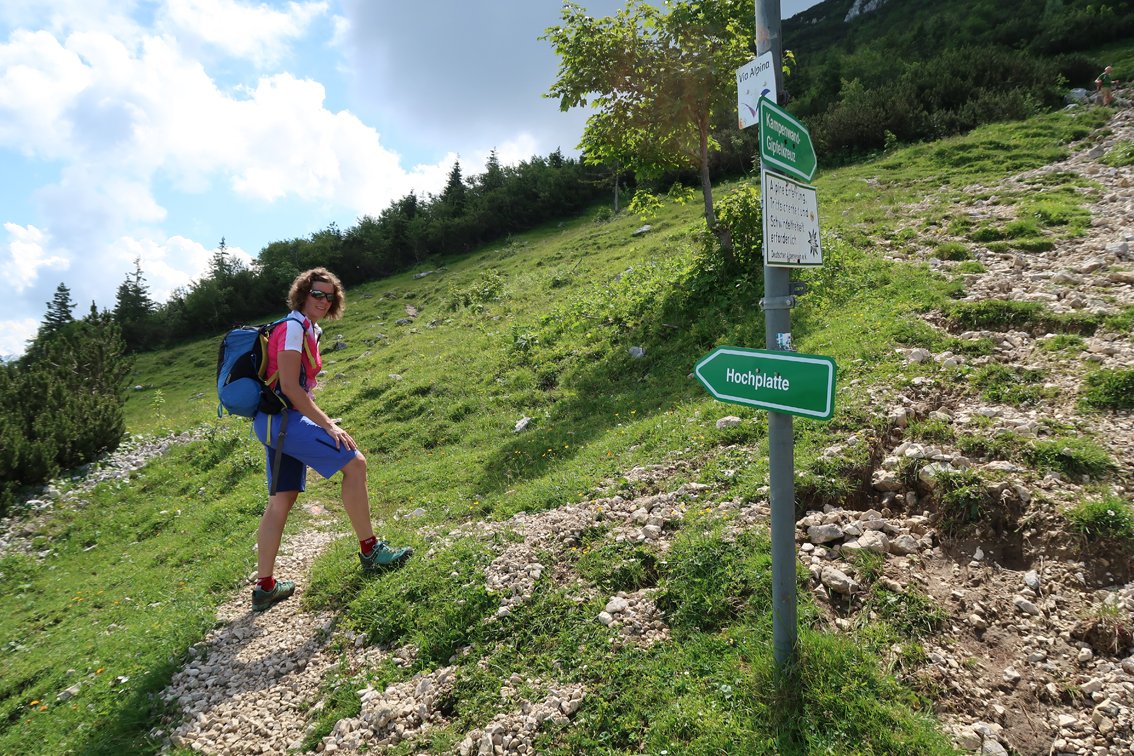 Von der Bergstation auf Weg und Forstraße anfangs kurz ansteigend in ca. 20 min bis kurz vor die Steinlingalm. Von dort auf dem steinigen Weg steil hinauf in Richtung Kampenwandkreuz. Bei den ersten Latschen zweigt man links in Richtung Hochplatte ab und folgt dem Pfad bis zur Hochplattenscharte. Auf der Südseite kurz versichert (A) hinunter und dann zum schon sichtbaren Grassattel aufsteigen. Auf der Südseite des Sattels zweig rechts ein Steig ab ("Sehr steiler Aufsteig auf eigenen Gefahr") ab. Auf diesem Steig tlw. steil durch Latschen hinauf zum Beginn des Stahlseils.