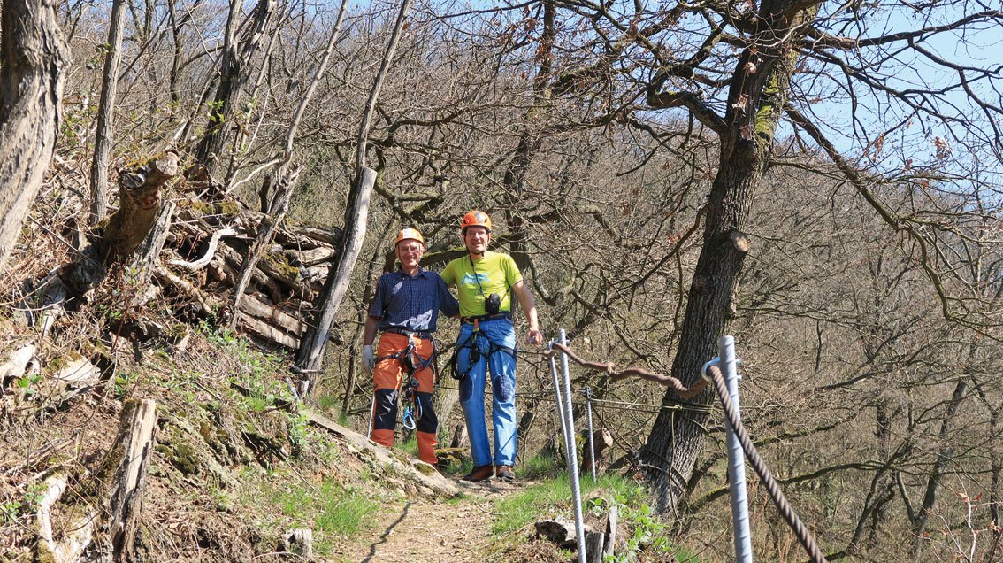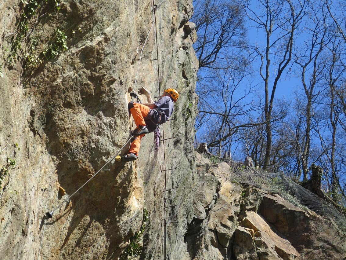 Der Karola-Klettersteig (Karolasteig) ist - Stand März 2017 - der schwerste Klettersteig Deutschlands! Ein einfaches Stahlseil verläuft an einer permanent leicht überhängenden Wand aufwärts, die Schlüsselstelle ist ein kleiner, glatter Überhang im unteren Abschnitt. Die zusätzlichen Klettertritte wurden erst 2016 dazugeschraubt, damit die Ferrata auch ohne Stahlstifte geklettert werden kann. Aber auch mit den neuen Tritten ist der Karola-Klettersteig eine satte Angelegenheit und hat seinen Stockerlplatz in der Liste der schwersten Klettersteige Europas sicher. Der Klettersteig wurde nach Wolfgang Pluschkes Frau Karola benannt - manche Frauen bekommen eben anstatt Blumen Klettersteige : - )