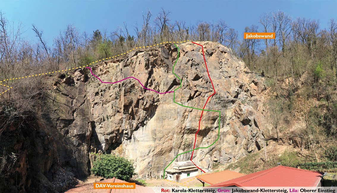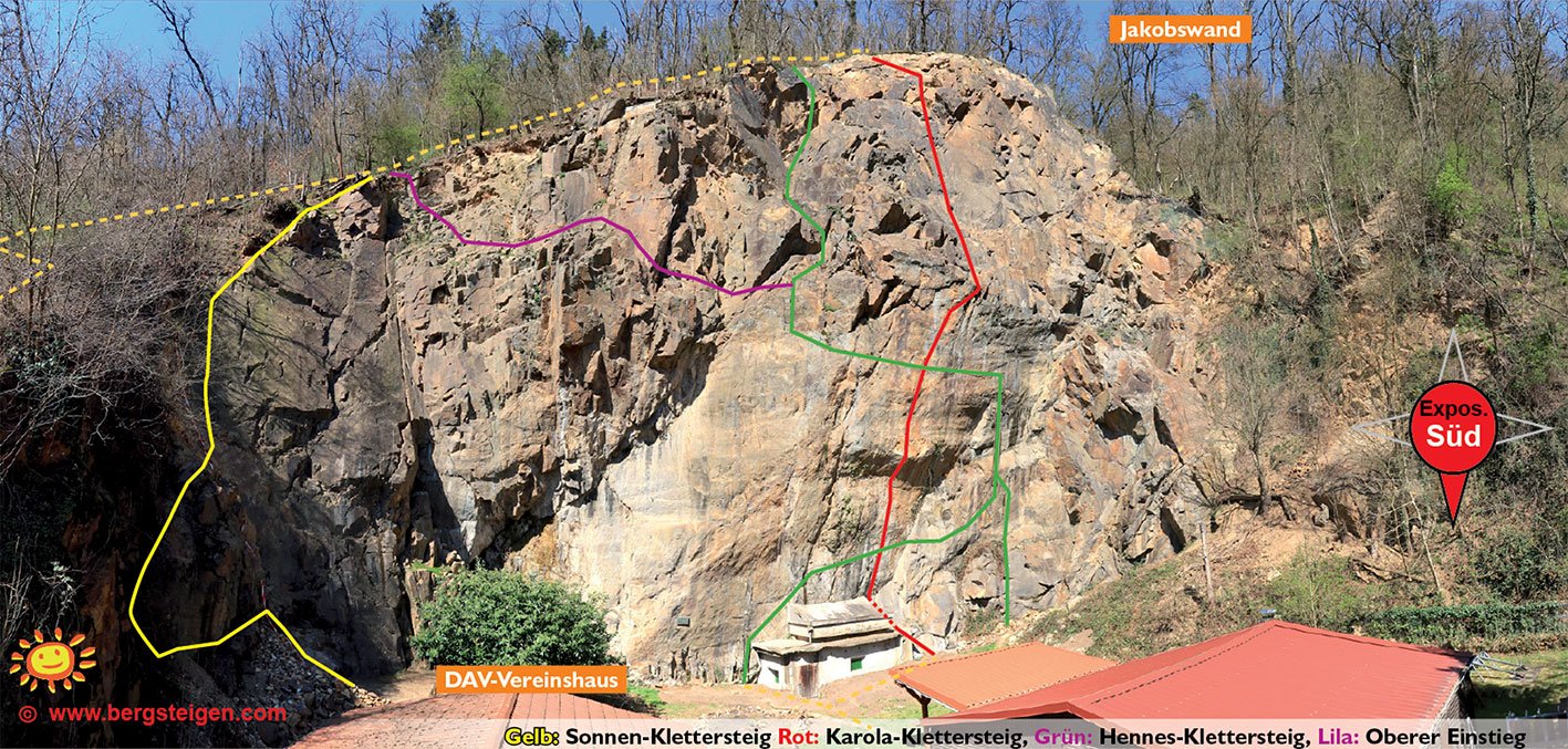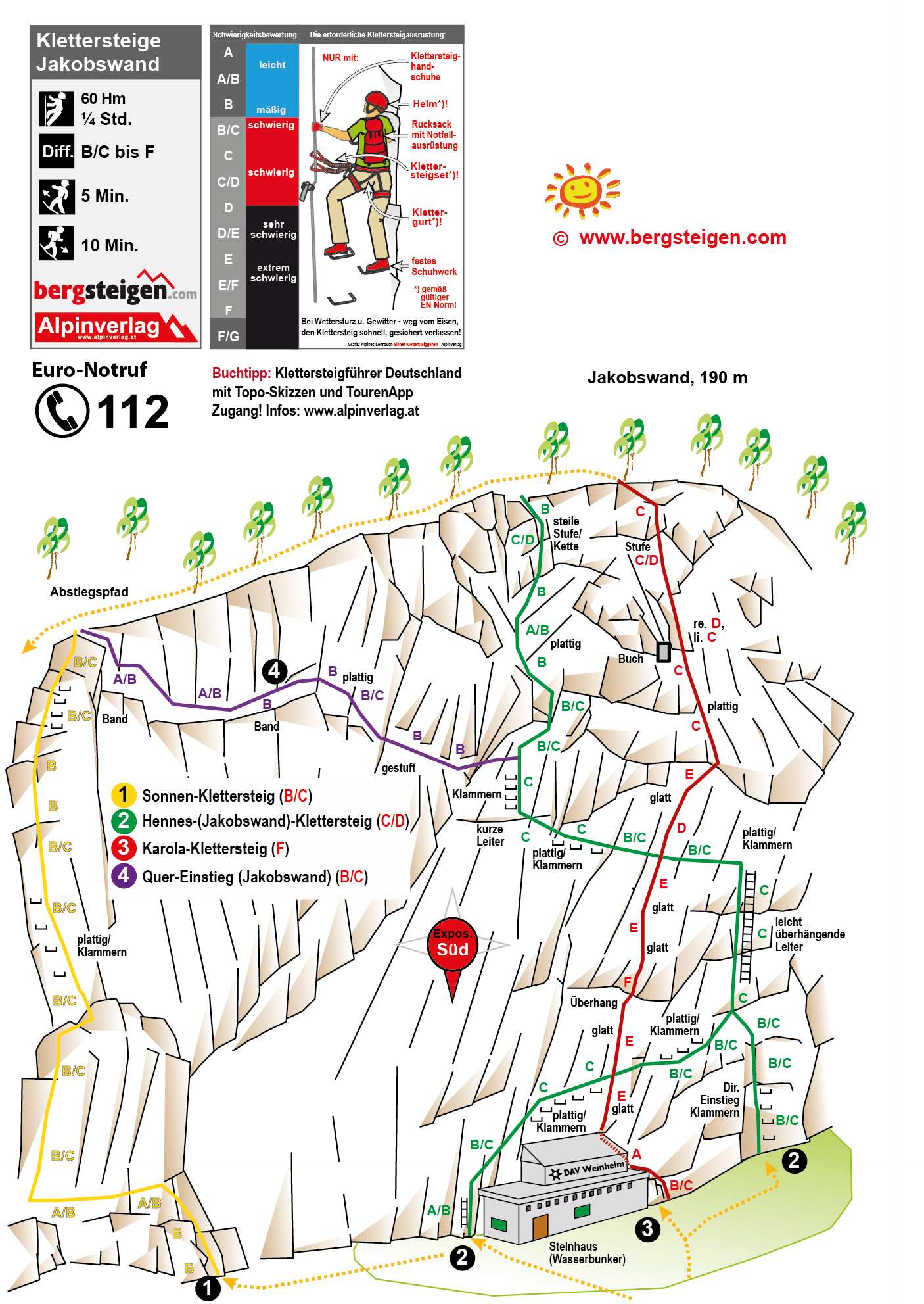 Es gibt einen oberen, leichteren Einstieg in den Klettersteig. Diesen erreicht man über den Abstiegspfad. Der Klettersteig ist für kleine Kinder nicht geeignet! Der Klettersteig liegt im eingezäunten DAV-Gelände Jakobswand. Man kann das Gelände nur zu den Öffnungszeiten betreten - siehe: www.dav-weinheim.de Die Benutzung ist für Nichtmitglieder der Sektion Weinheim kostenpflichtig. Alpenvereinsmitglieder bezahlen 3,5 Euro; Nichtmitglieder 6 Euro (Stand 2017). Neben der Jakobswand (Klettersteig und Klettertouren) gibt es im DAV-Gebäude eine kleine Boulderhalle.