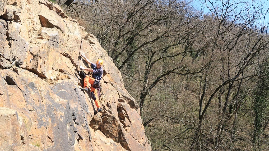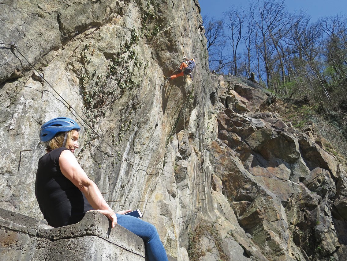 Vom Ausstieg nach links und auf dem Pfad am Zaun entlang hinunter. Unten dann wieder zurück zum DAV-Zentrum mit dem Kletterturm.