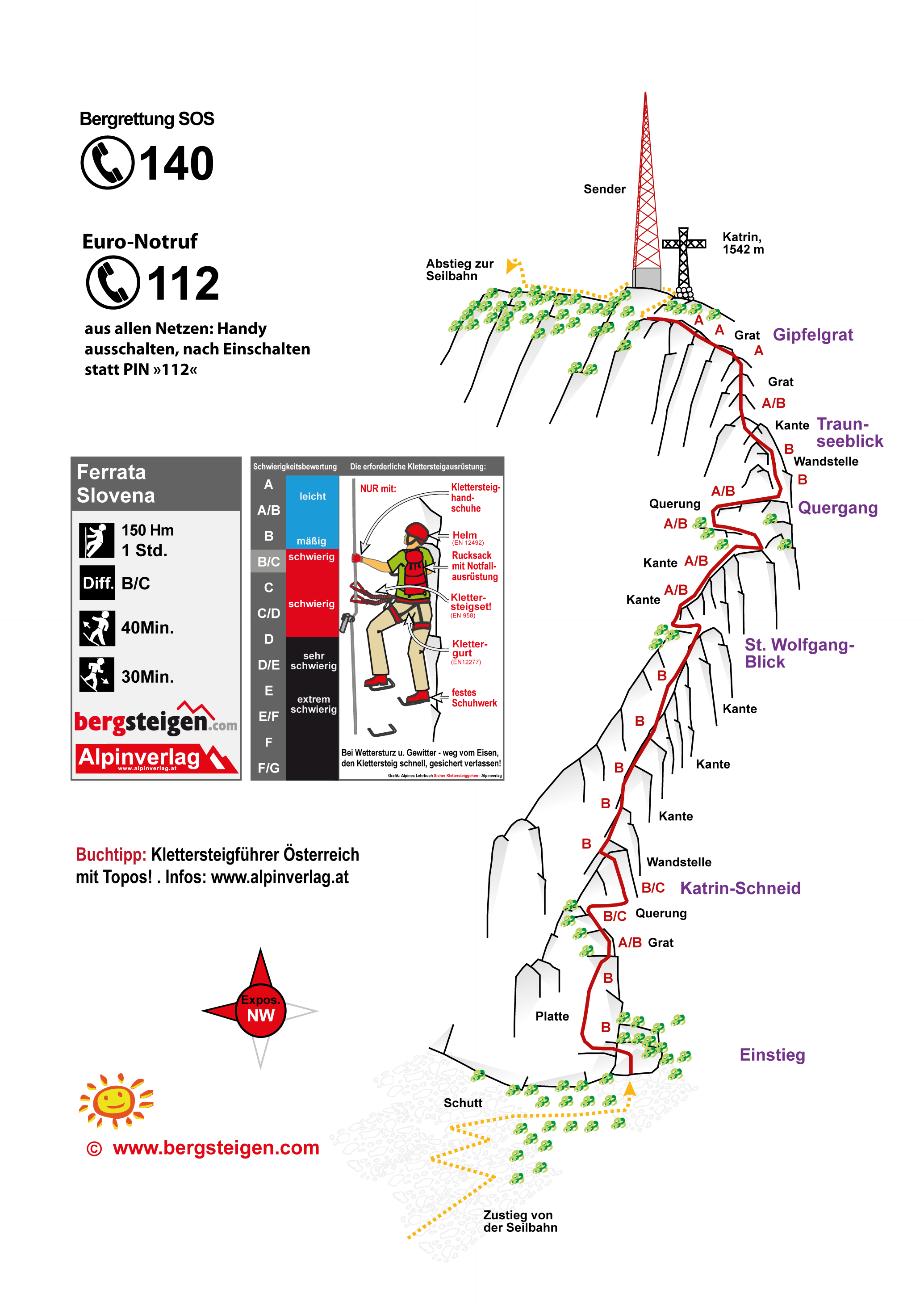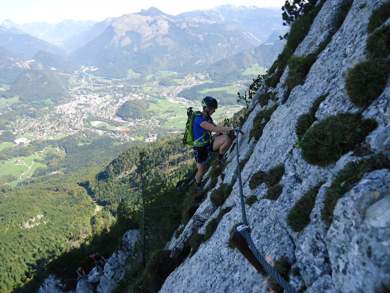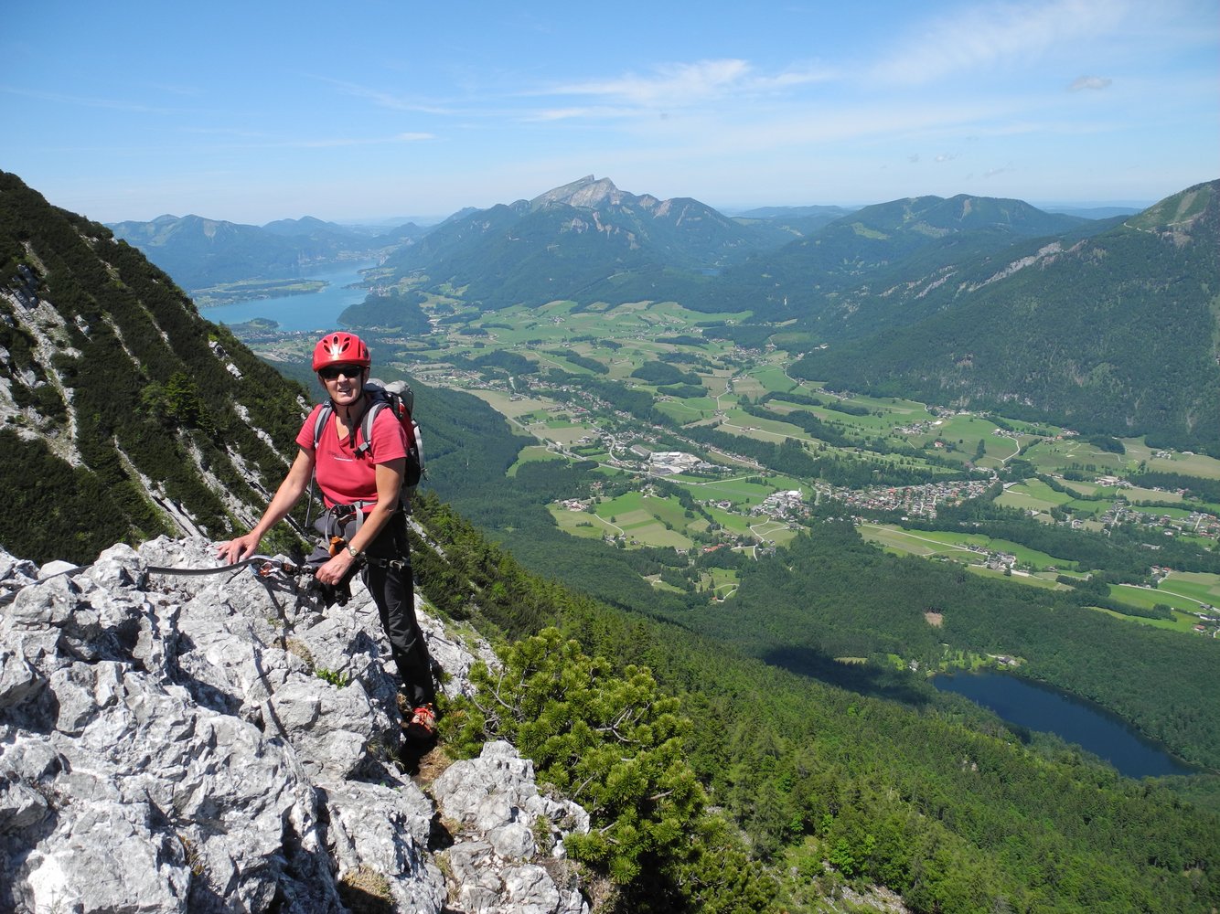 Schöner Klettersteig an der Katrin hoch über dem Kurort Bad Ischl. Der 300 m lange Steig verläuft immer recht luftig an einer Kante, ist aber nie richtig schwer - man steigt direkt beim großen Gipfelkreuz aus der Wand. Während der Tour sieht man fünf Seen - Traunsee, Wolfgangsee, Nussensee, Schwarzensee, bei guter
