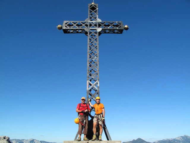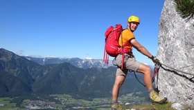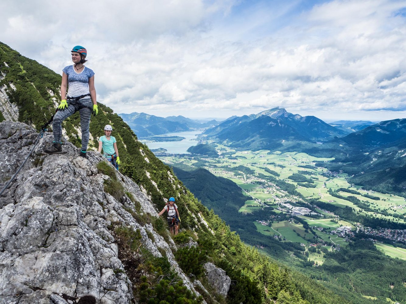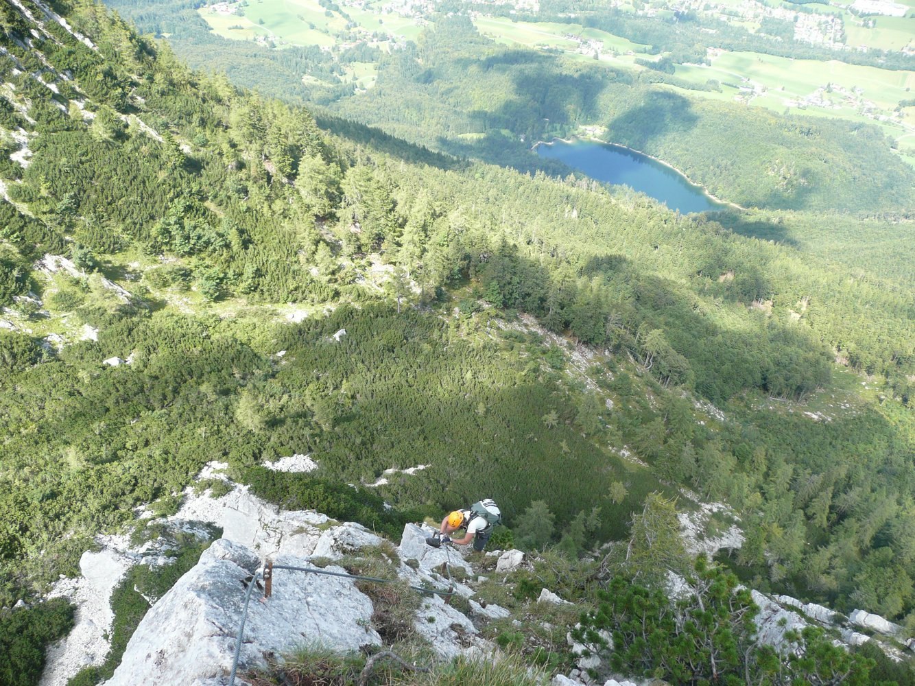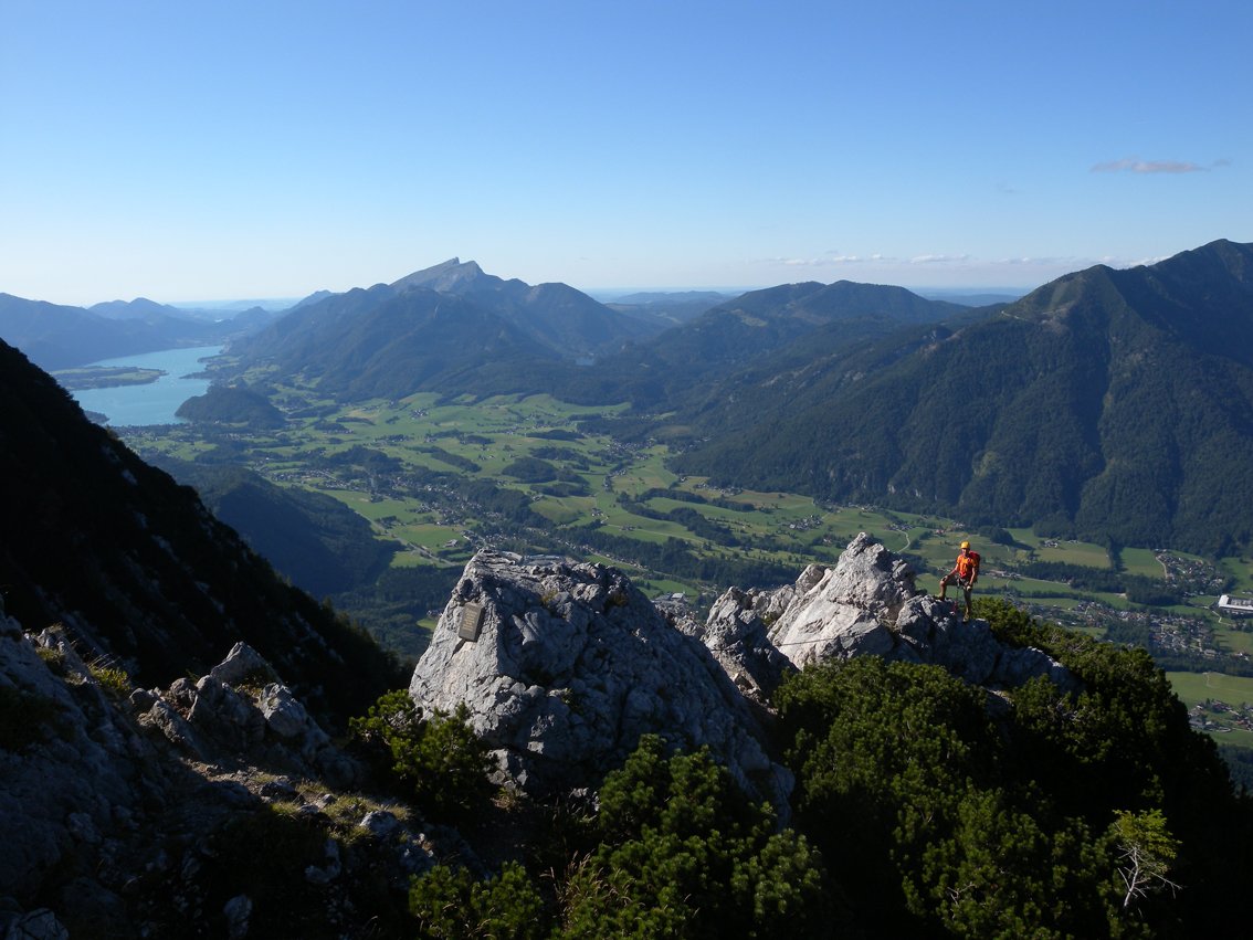 Schöner Klettersteig an der Katrin hoch über dem Kurort Bad Ischl. Der 300 m lange Steig verläuft immer recht luftig an einer Kante, ist aber nie richtig schwer - man steigt direkt beim großen Gipfelkreuz aus der Wand. Während der Tour sieht man fünf Seen - Traunsee, Wolfgangsee, Nussensee, Schwarzensee, bei guter