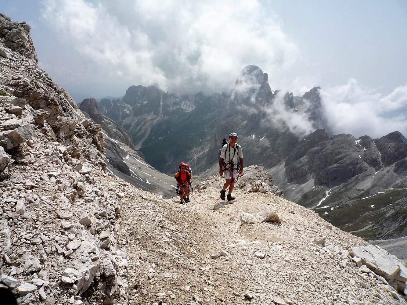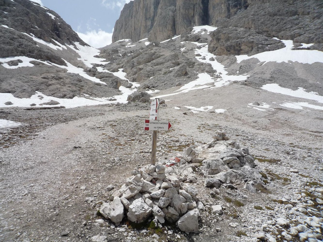Eine schöne Runde nach dem Abstieg über den Ostanstieg: Im Antermoiatal über den Scalette Steig, welcher noch vor dem Antermoia See auf dem Weg 583 B rechts zum Passo Laussa (2700 m) führt. Dort weiter über den Passo Scalette (dort kurz versichert, A) zum Rifugio Gardeccia zurück (ca. 2 Std.). Talabstieg Gardeccia – Pera (Val di Fassa) ca. 1 Std..
