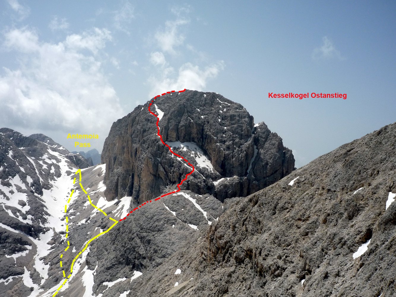 Westanstieg: Kurz in eine von einem Vorbau verdeckte Rinne queren, und durch diese zu einem Band aufwärts (Stellen 1-). Dem Band (A) zu einer Leiter folgen, über welche man (A) auf ein weiteres Band absteigt. Dort anfangs auf dem noch schmalen und versicherten (A u. A/B) Felsband leicht ansteigen, bis der Steig links über eine steile Felsstufe (A/B und B) zum nächsten Querband führt. Diesem linkshaltend, stellenweise versichert (A) bis kurz vor den Nordgrat folgen. Auf diesem rechts, gestuft (A) zum Gipfelgrat und auf dem Grat südlich zum höchsten Punkt. Ostanstieg (Abstieg): Auf dem Gipfelgrat noch ein kurzes Stück nach Süden, bis man auf die ersten Versicherungen trifft, die unschwierig (A) zur Ostwand leiten. Links einer Geröllrinne auf ein anfangs wieder schmales Band absteigen (A). Dem Band nach Norden, um ein Eck herum folgen (A) und auf der großen Schotterrampe auf einer Wegspur weiter absteigen, bis der Steig das Band nach links zu den Felsen verlässt. Weiter abwärts (seilversichert und zwei Leitern) zum Vorbau, der spaltartig vom Hauptfels getrennt ist. Den Vorbau, an dessen rechten Rand, anfangs im Gehgelände, dann versichert (A) weiter absteigen und nach rechts durch eine Rinne verlassen. Noch eine kurze versicherte Passage (A) und schon steht man im Antermoia-Tal.