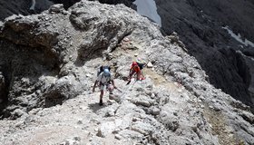 Der Kesselkogel überragt mit zwei Metern die 3000er Grenze und ist damit auch die höchste Erhebung im Zentrum von König Laurins Reich. Die Kesselkogel Überschreitung lässt sich perfekt mit anderen Steigen zu einer Zwei- oder Mehrtagestour verbinden. Von Norden kommend mit dem Laurenzi Klettersteig und von Süden mit den Rotwandsteigen oder dem Santnerpass Klettersteig. Wer es leichter mag, dem sei die Verknüpfung mit dem Scalette Steig ans Herz gelegt.