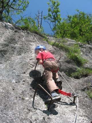 Vor allem für Einsteiger und Kinder ideal. Großer Spielplatz und Tiere beim Almgasthof Kleefeld; ein Anfängerklettergarten ist links vom Klettersteig.