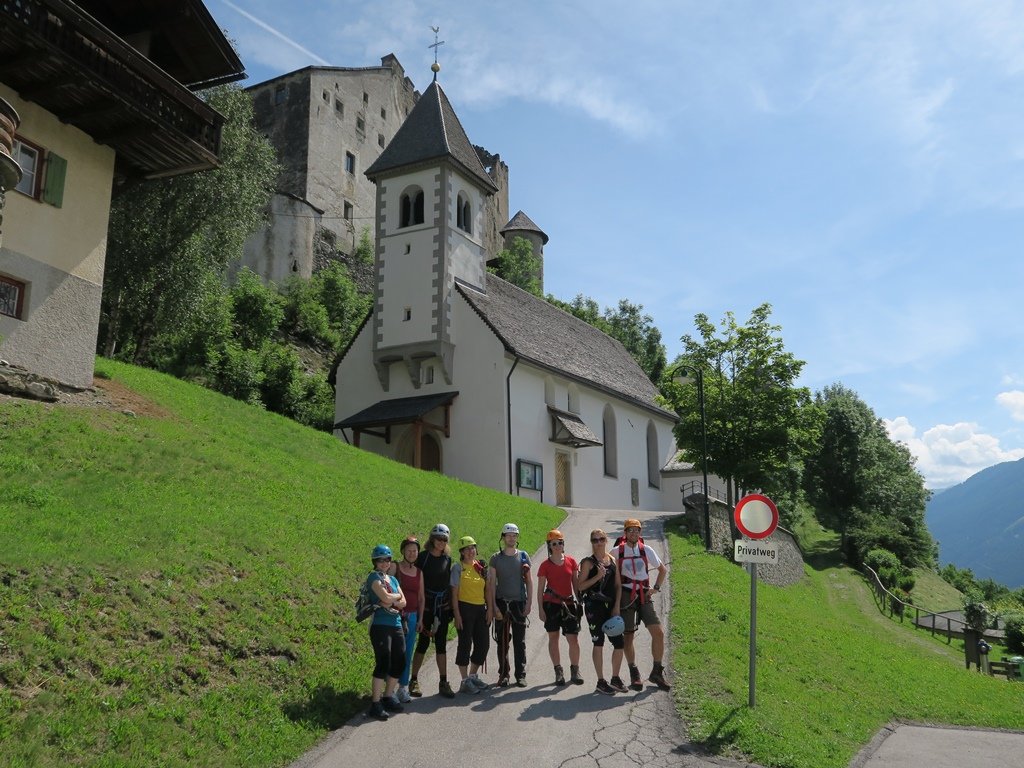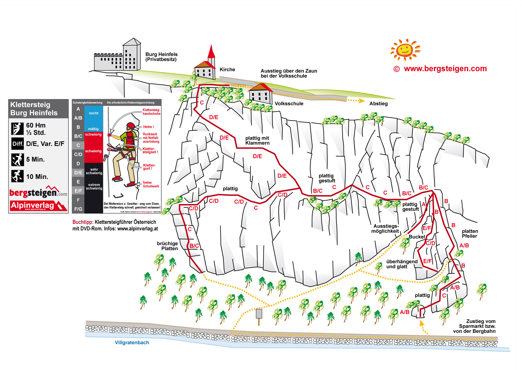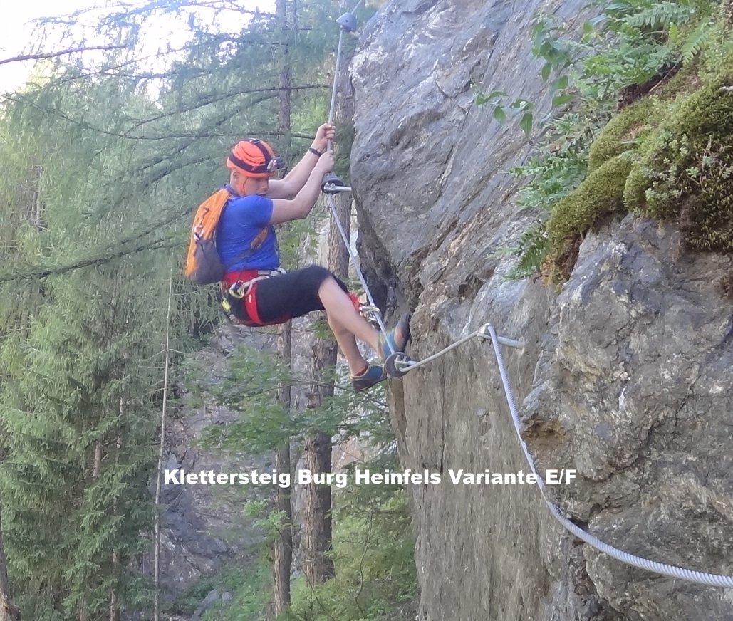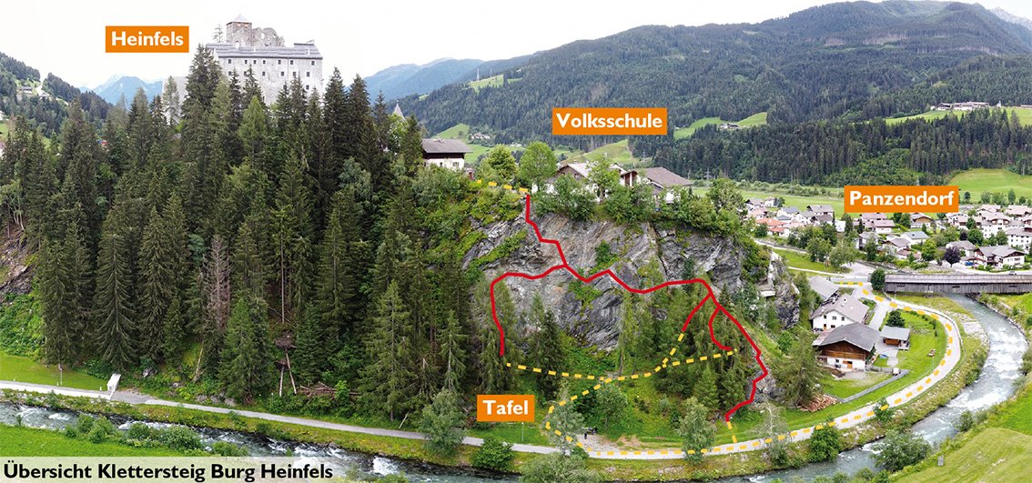 Kurzer Sportklettersteig entlang der Felsen der Burg Heinfels. Der Klettersteig wurde im Sommer 2016 errichtet und erlaubt aufgrund diverser Varianten mehrere Kombinationsmöglichkeiten. Der sehr kurze, nur 15 Hm umfassende Familienklettersteig (C) ist bedingt kindertauglich, der Rest der Anlage eher nicht. Für sehr kräftige Klettersteiggeher steht eine Variante mit zwei überhängenden, trittarmen E/F-Stellen bereit. Man muss schon über solides Klettersteigniveau verfügen, um an diesem Felsen Freude zu haben.