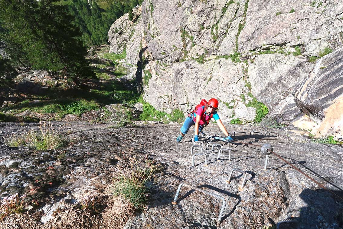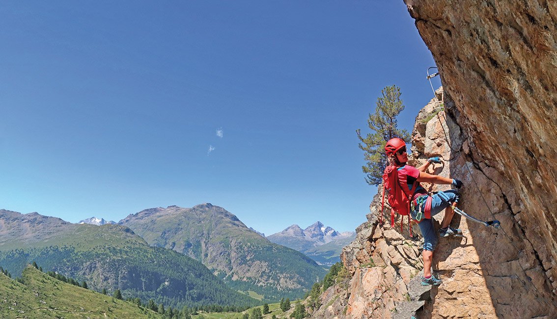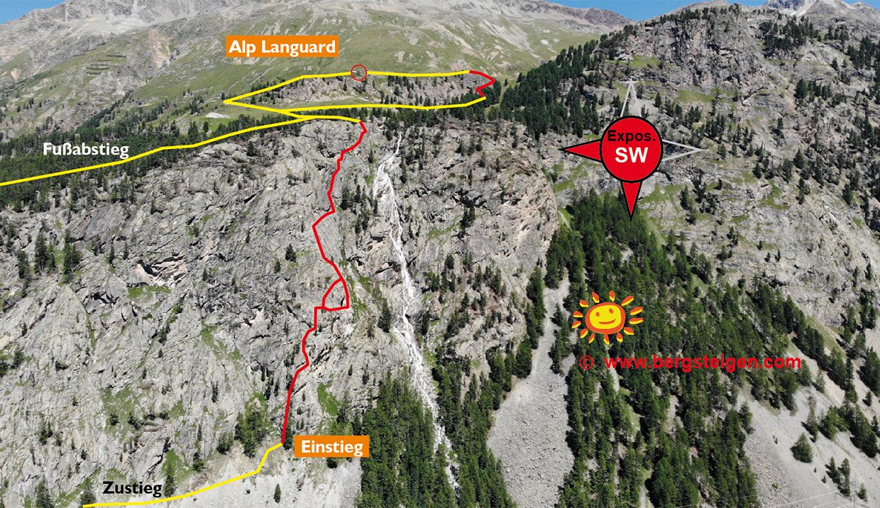 Erst nach zwei Projektanläufen und fast fünf Jahre nach dem ersten Bewilligungsansuchen konnte der Klettersteig neben dem Languard-Wasserfall am 4. Juli 2009 eröffnet werden (der obere Teil wurde später dazu gebaut). Zu heikel war die Umweltsituation mit dem Jagdbanngebiet, wo in der steilen Wand 34 verschiedene Vogelarten nisten. Letztlich wurde ein Kompromiss fixiert: Vom 1. Juli bis 31. Oktober dürfen die Ferratisten in der Südwestwand schwitzen und in der kühleren Jahreszeit gehört die gesamte Wand dem Federvieh zum Nisten. Der gut 550 m lange Eisenweg hat Sportklettersteigcharakter und ist durch die Action-Elemente und die geschickte Einbettung in die Wand über Platten, Kanten und Überhänge auch sehr abwechslungsreich. Laut dem Prospekt von Pontresina Tourismus eine Ferrata für Berggenießer, Eventgruppen, Familien, Bergsportanbieter, Bergführer mit Gästen - am wohlsten wird sich aber wahrscheinlich doch der ambitionierte Klettersteiggeher fühlen.