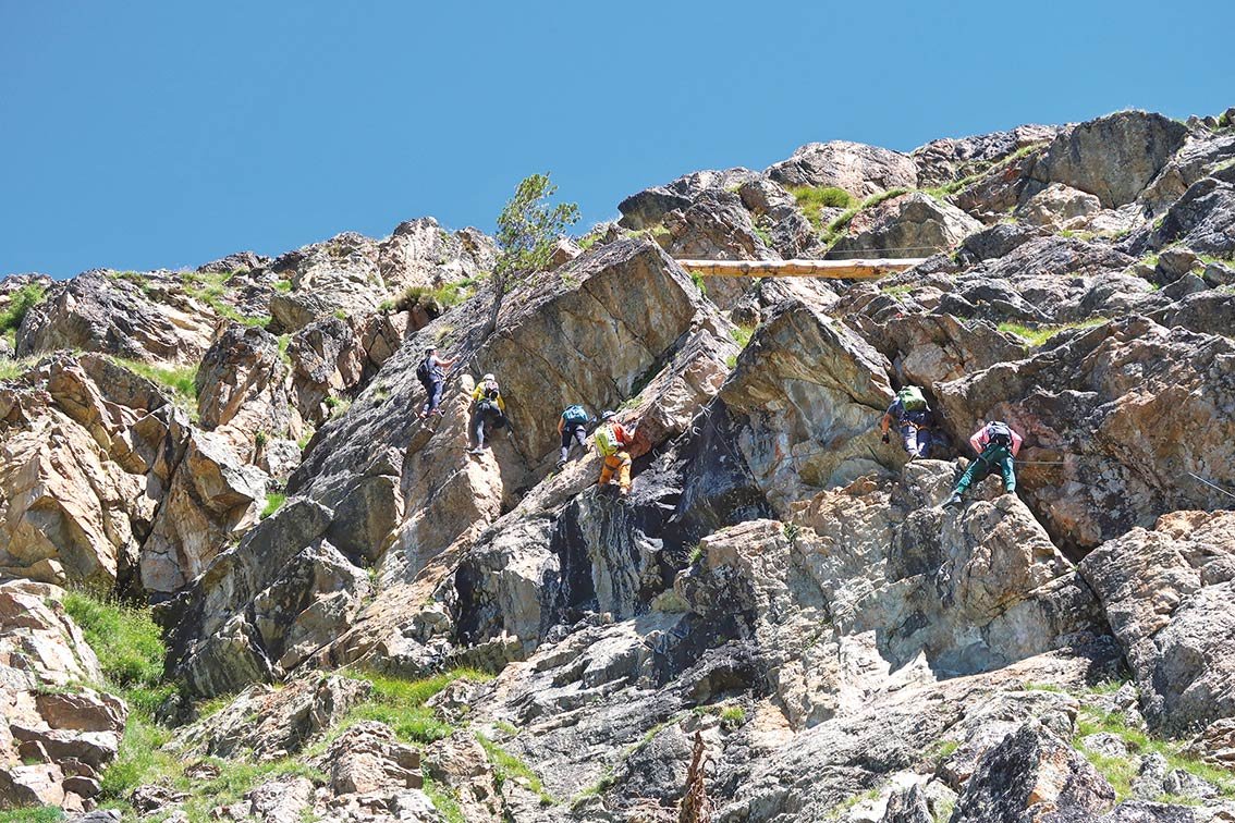 Siehe Topo: Am Einstieg bei einer Tafel auf einem flachen, plattigen Pfeiler aufwärts, meist A/B, kurze Stufe B hinauf zu einem Band. Auf diesem unschwierig (A) nach rechts zur 3-Seilbrücke (B) aufsteigen. Die führt zum Adlerhorst, einer steilen Wand (C/D und C; kann man links umgehen) und zur Rastbank. Weiter über schöne Platten (A/B) nach rechts unter eine Wand, der man nach rechts bis zum „Spinnennetz“ folgt. Nach dem großmaschigen Netz (C/D) gelangt man rechts ansteigend (A/B) zur „Schwarzen Platte“ (B). Es wechseln Platten und steile Wandaufschwünge ab (max. C), bis man den Ausstieg nahe des Röntgenwegs auf einer Höhe von 2198 m erreicht. Man folgt der Markierung weiter in Richtung Alp Languard, zweigt auf der Höhe einer Hütte rechts ab und gelangt zum Teil 2. Eine Querung führt zu einer steilen Kante (C), danach über einen Balken und eine abfallende Querung (A und A/B) zur Schlusswand. Nach einer kurzen steilen Passage (C) erreicht man eine 3-Seil-Brücke (B) und klettert danach das Finale (C/D) bis zum Ausstieg auf einer Bergwiese.