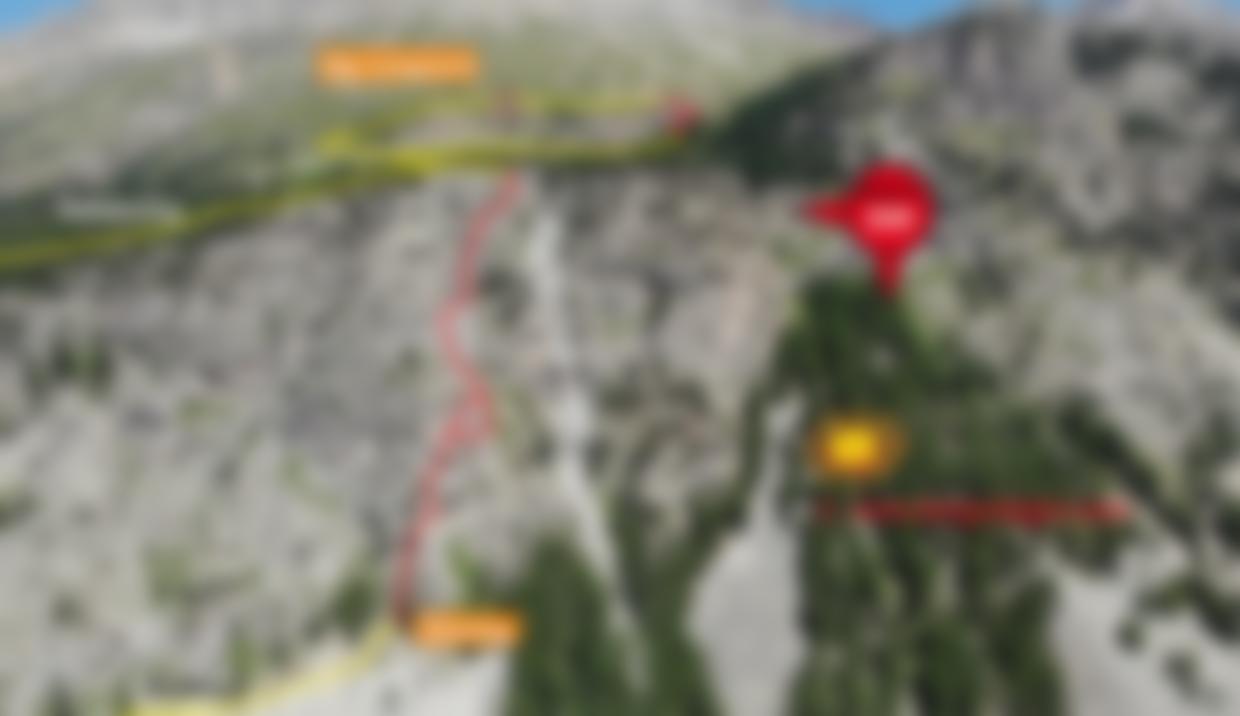Auf der anderen Straßenseite auf dem Schotterweg kurz talauswärts. Auf der Rückseite der Häuser kommt man zu einem Schutzwall (Klettersteigtafel). Dort führt ein Pfad im Linksbogen anfangs durch lichten Wald hinauf, später rechts, querend im Schutt zum neuen Einstieg.