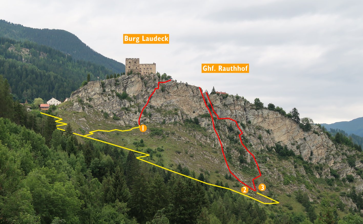 Drei kurze Klettersteige an den Felsen der Burg Laudeck (Laudegg). An der südseitigen Schieferwand gibt es einen leichten (B/C) Klettersteig, welcher für Kinder mit Kletterfertigkeiten geeignet ist. Weiters sind ein mittelschwerer Klettersteig (C) und ein sehr schwerer Klettersteig (D/E) vorhanden. Beendet wird das Klettersteigabenteuer nicht mehr direkt beim Gasthof Rauth-Hof - man muss über die Claudia Augusta Route abklettern! Die Klettersteiganlage bietet eine anregende Halbtagesunternehmung und ist eine gelungene Bereicherung für die Region im westlichen Tiroler Oberland.
