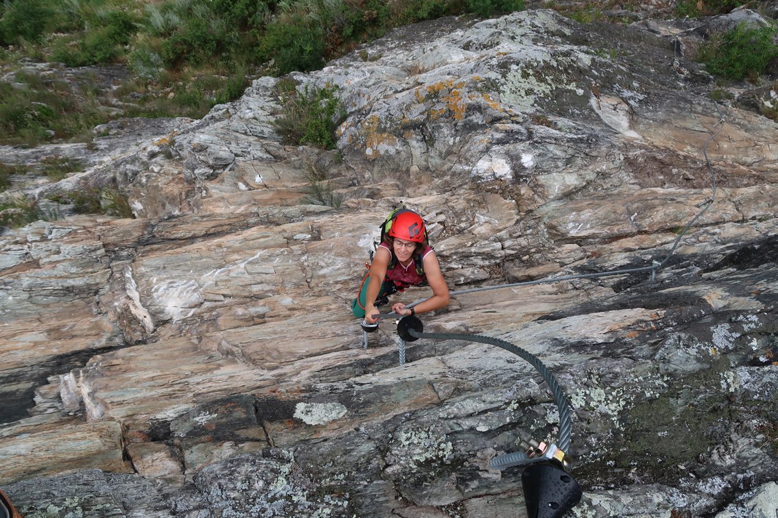 Gut mit Stahlseil und Bügeln gesichert - ab und zu sind die Ankerabstände etwas weiter (z.B. E-Stelle am Einstieg des schweren Klettersteiges).