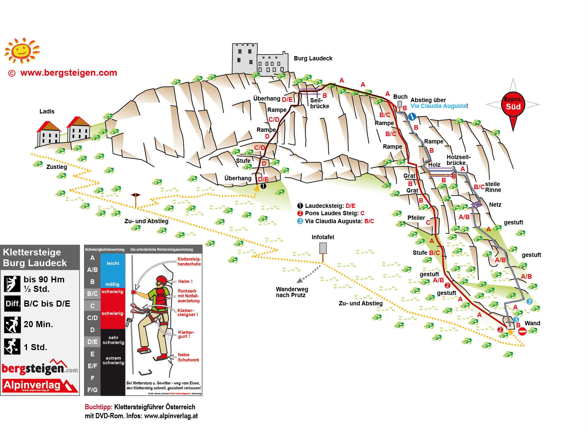 Drei kurze Klettersteige: Via Claudia Augusta: B/C Pons Laudes Steig: C Laudecksteig: D/E
