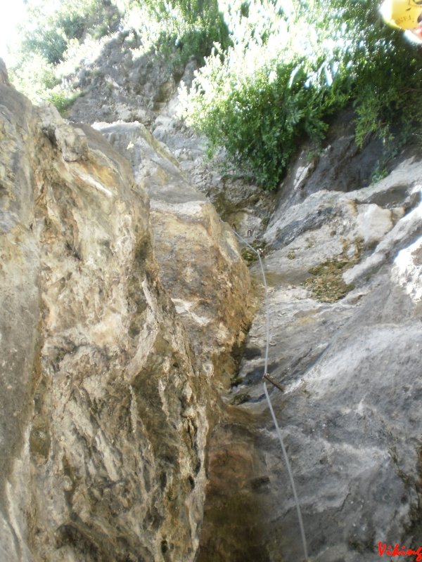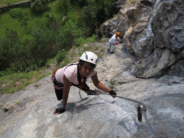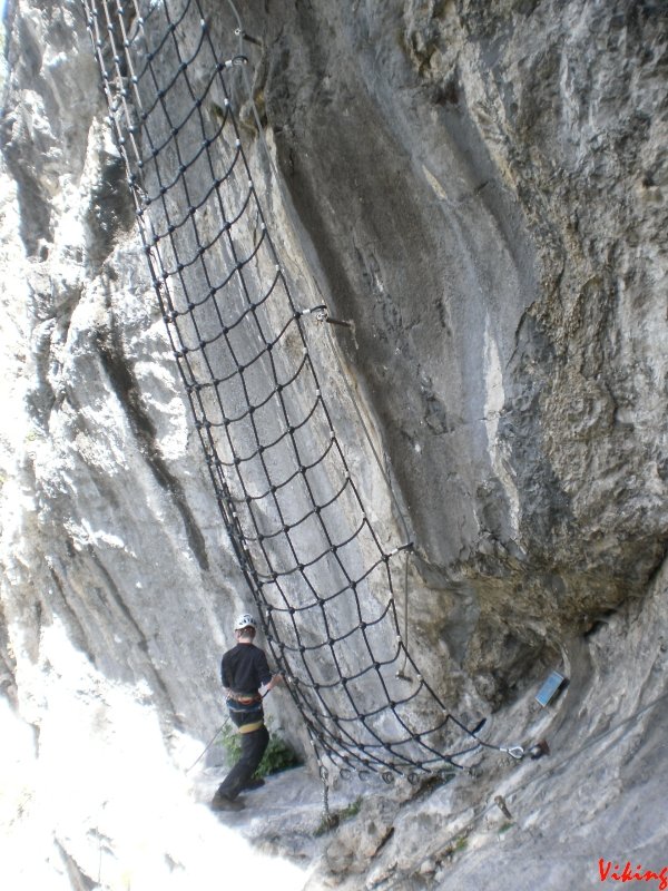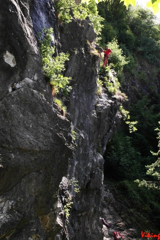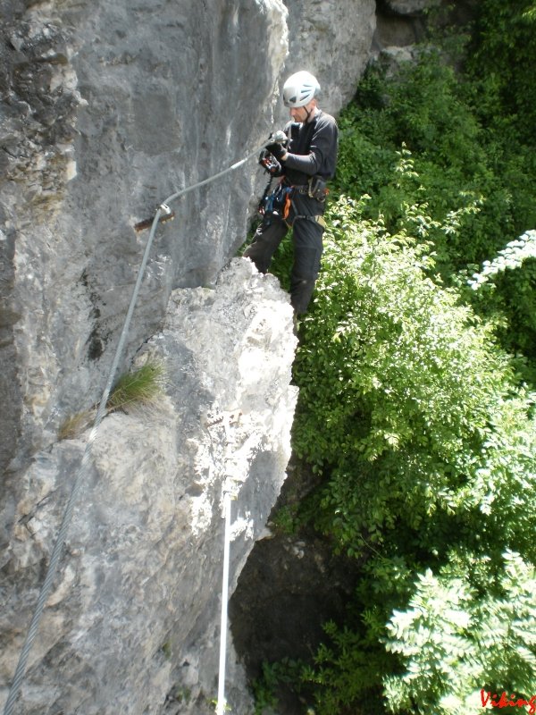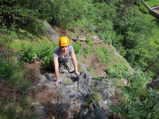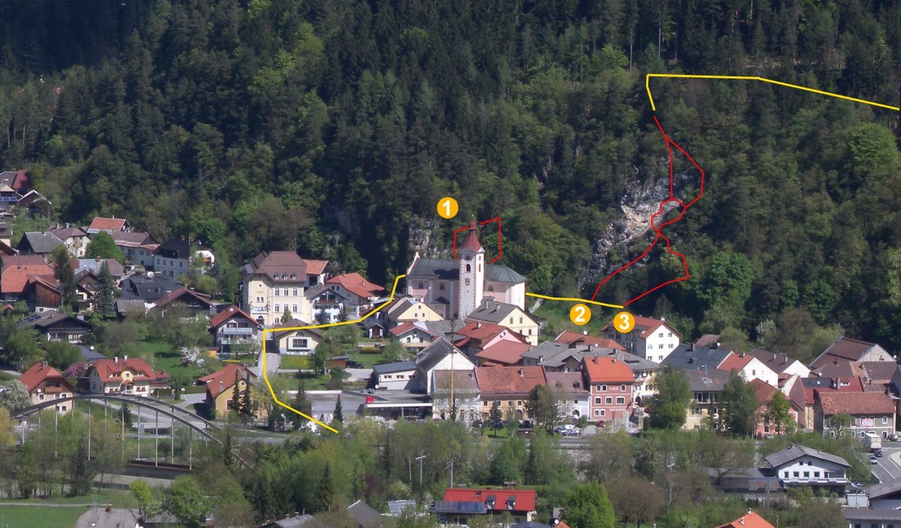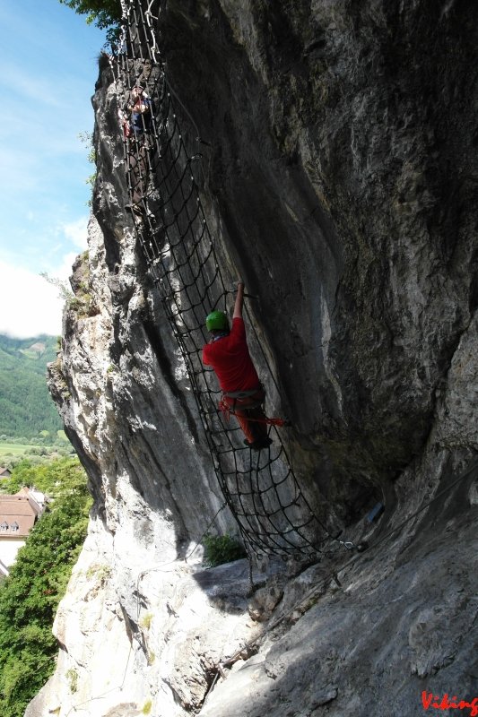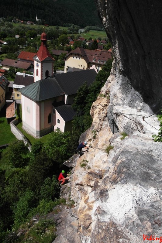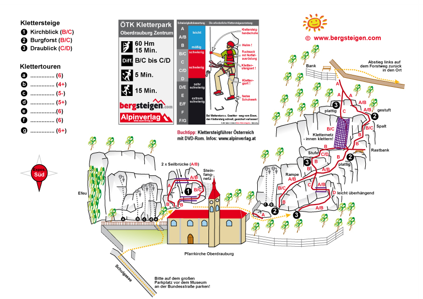 Siehe Topo. Links ist die Kirchblick(B/C), rechts sind die längeren Klettersteige Burgforst(B/C) und Draublick(D - mit Kletternetz oben)