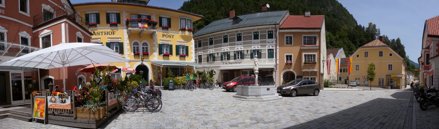 Vom Ausstieg der rechten Klettersteige auf dem Forstweg nach rechts zurück in den Ort und durch den Ort wieder zum Parkplatz.