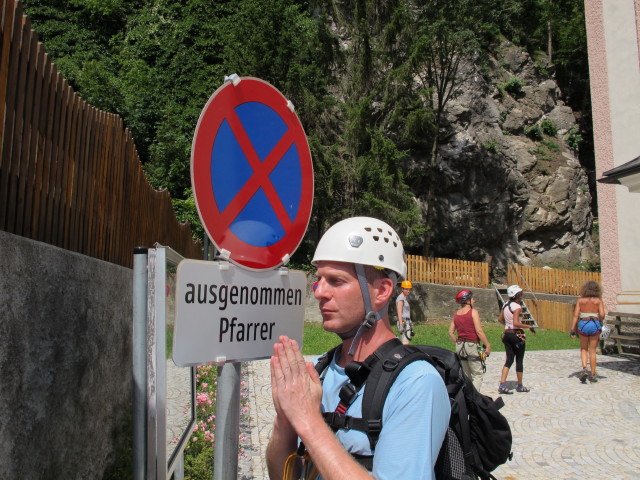 Vom Parkplatz durch die Schulgasse zur Kirche. Direkt hinter der Kirche sind die Klettersteige.