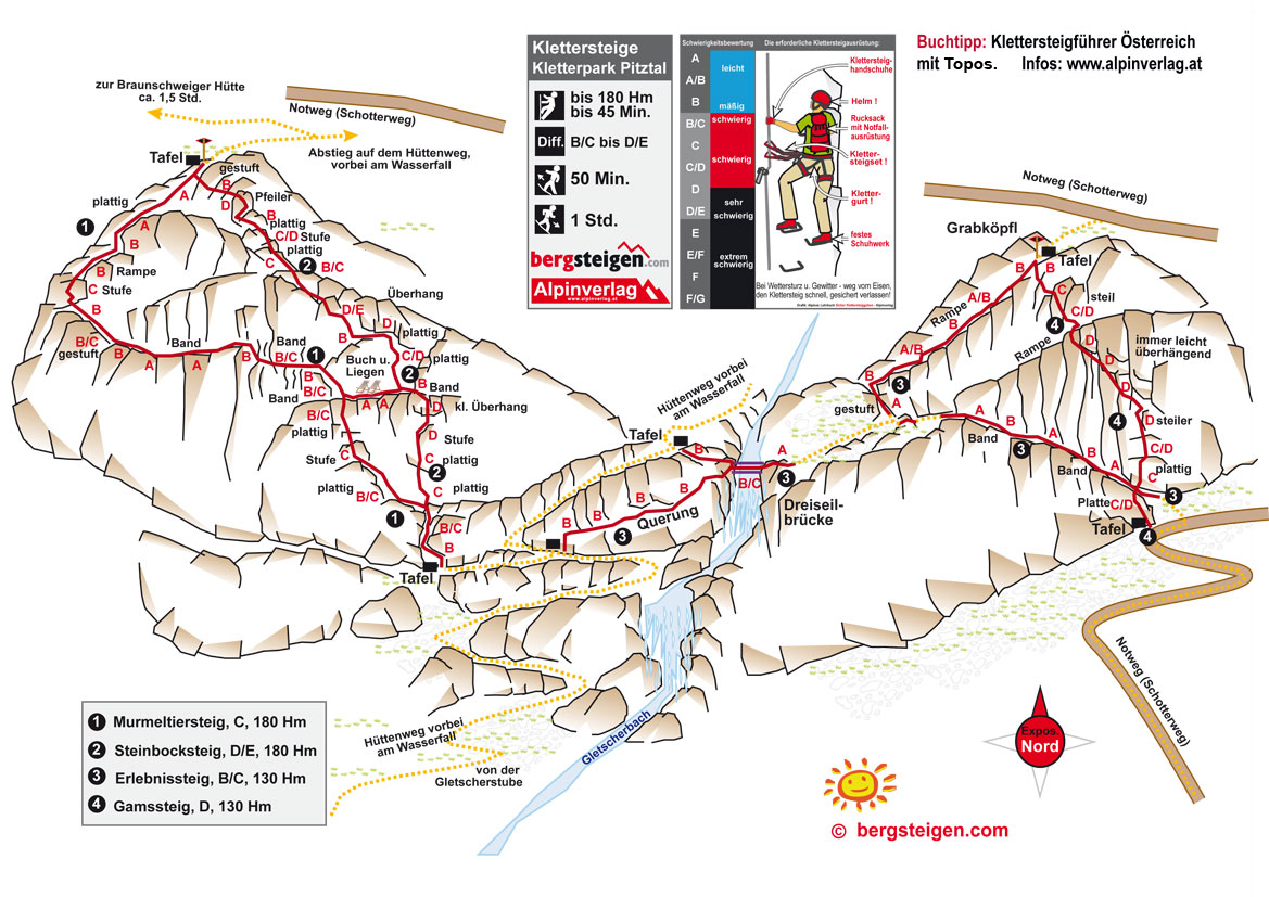 Murmeltiersteig (C; 180 Hm): Der linke Familienklettersteig - eine Stufe C, meist aber um B/C und B. Steinbocksteig (D/E; 180 Hm): Zweigt nach dem ersten Aufschwung des Murmeltiersteiges re. ab und zieht gerade hinauf - einige Stellen D, eine Stelle D/E. Erlebnissteig (B/C; 130 Hm): Verbindet mit der Balancierstation (B/C) die Steige links und rechts des Wasserfalles, dann leichter Anstieg (B) auf das Grabköpfl. Gamssteig (D; 130 Hm): Im Gesamten vielleicht der anspruchsvollste Steig im Kletterpark; es gibt unten viele D-Stellen ohne Rastposition.