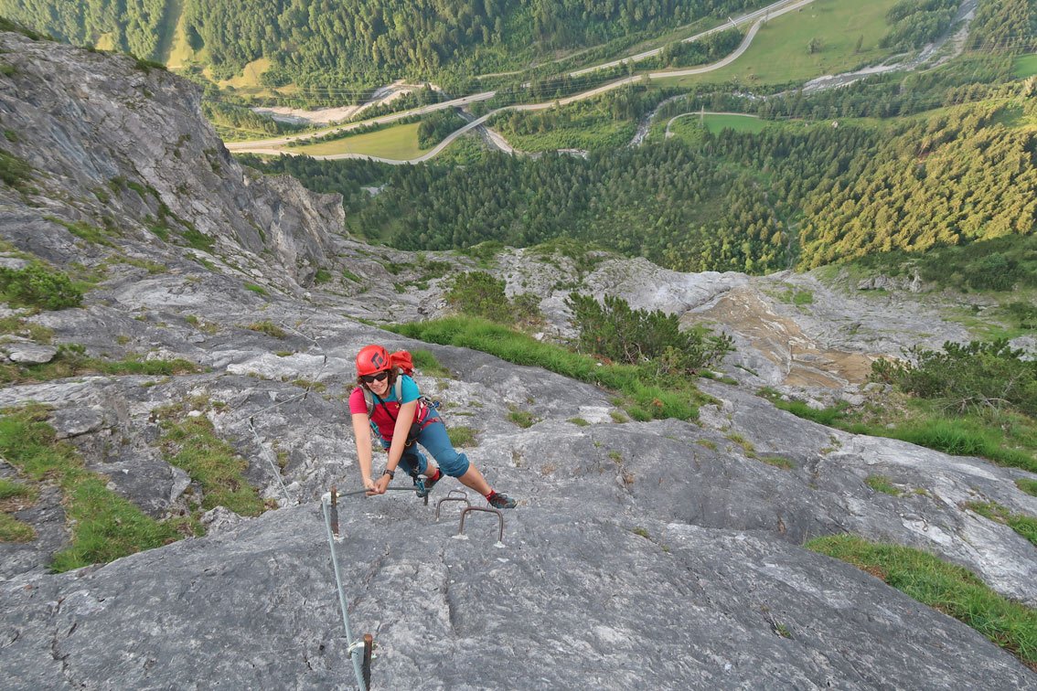 Die gewaltige Fallbachwand mit dem gleichnamigen Wasserfall war bis dato immer nur bei den Eiskletterern ein top Alpinziel. Im Frühjahr 2018 wurde rechts neben dem Wasserfall ein langer, mittelschwerer Klettersteig an die Wand gebaut. Ist bei den Eiskletterern die senkrechte, komplett freistehende Eissäule die Herausforderung schlecht hin, hat der Klettersteig keine technische Höchstschwierigkeiten – aber die Summe der vielen C/D und C Passagen sind die Challenge! Auch gut trainierte Klettersteiggeher heben spätestens ab dem Mittelteil des öfteren den Kopf, betrachten die nicht enden wollende Felswand und suchen nach dem Ende des Klettersteiges. Fazit: Nichts für Einsteiger – für Ferratisten mit etwas Ausdauer in den Unterarmen aber ein absolutes Muss!