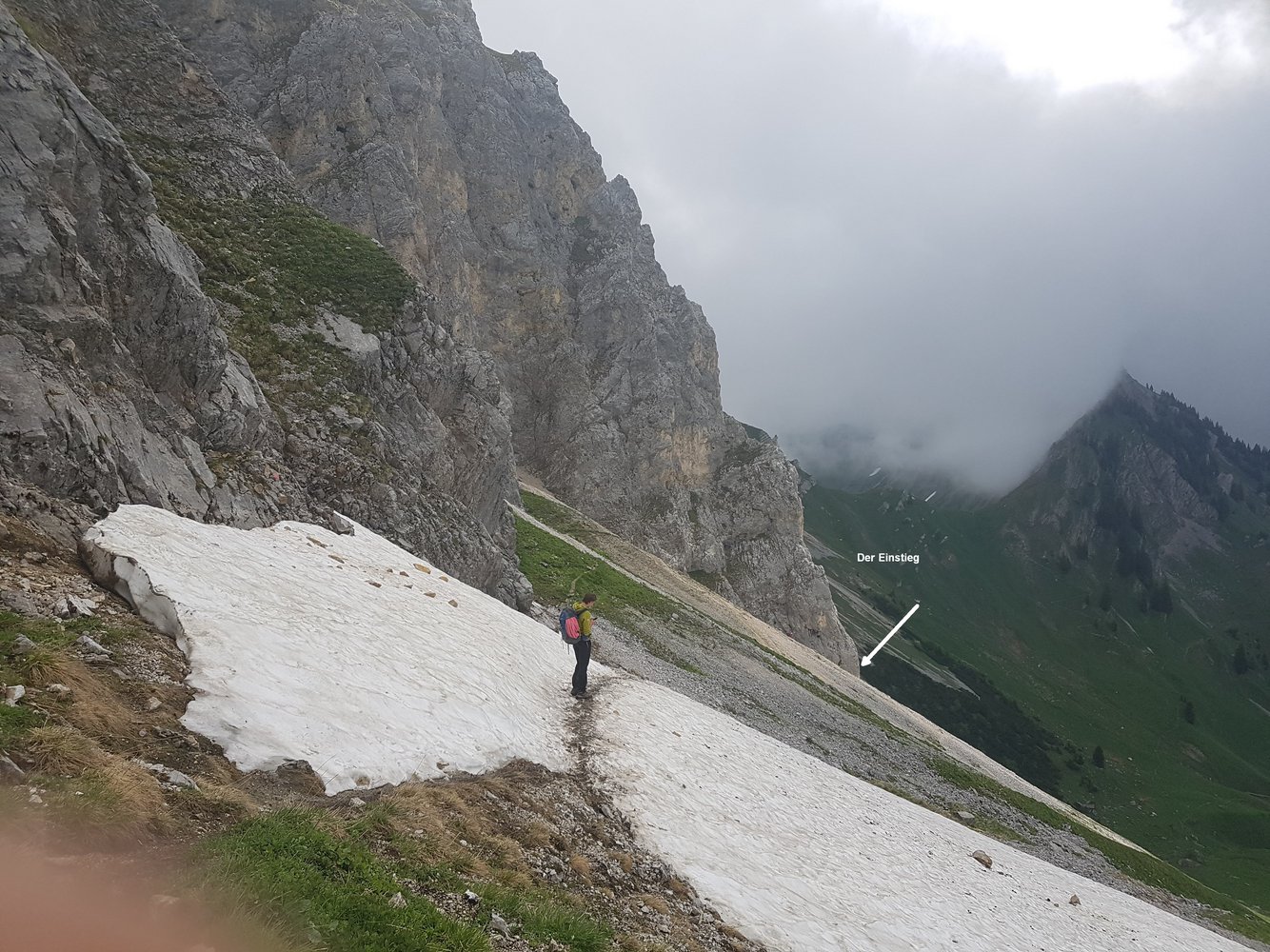 Achtung: Der Abstieg ist alpin! - Kletterstellen bis 1, teilweise ausgesetzt und brüchig - auf Steinschlag ist zu achten! Bei Schneelage und Nässe gefährlich (der Schnee hält sich im Frühjahr auf der Nordseite recht lange, Informationen zu den Verhältnissen beim Gimpelhaus oder der Tannheimer Hütte).
