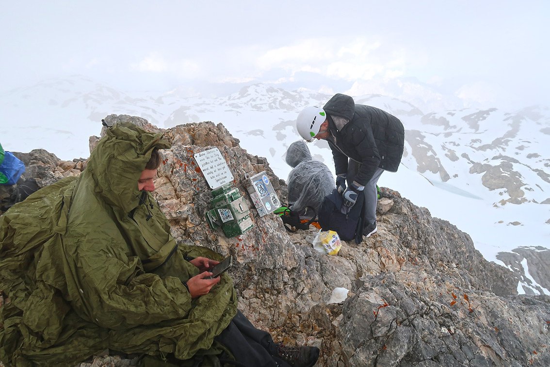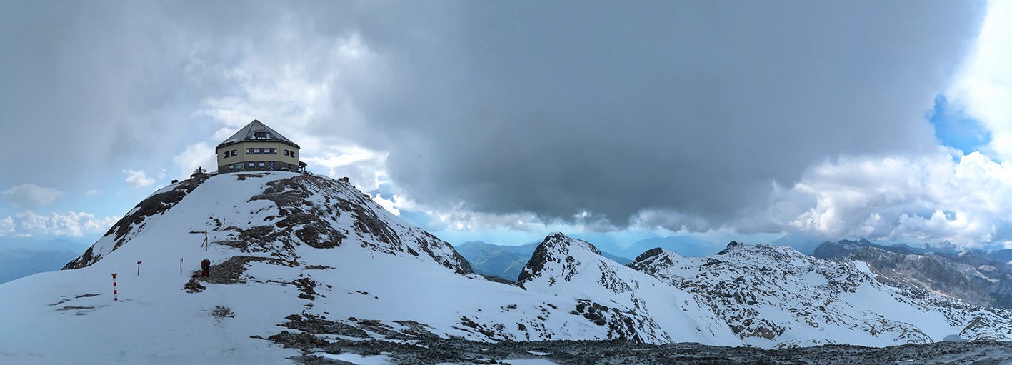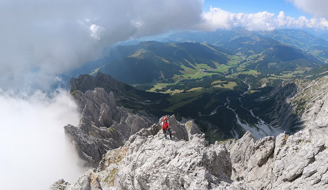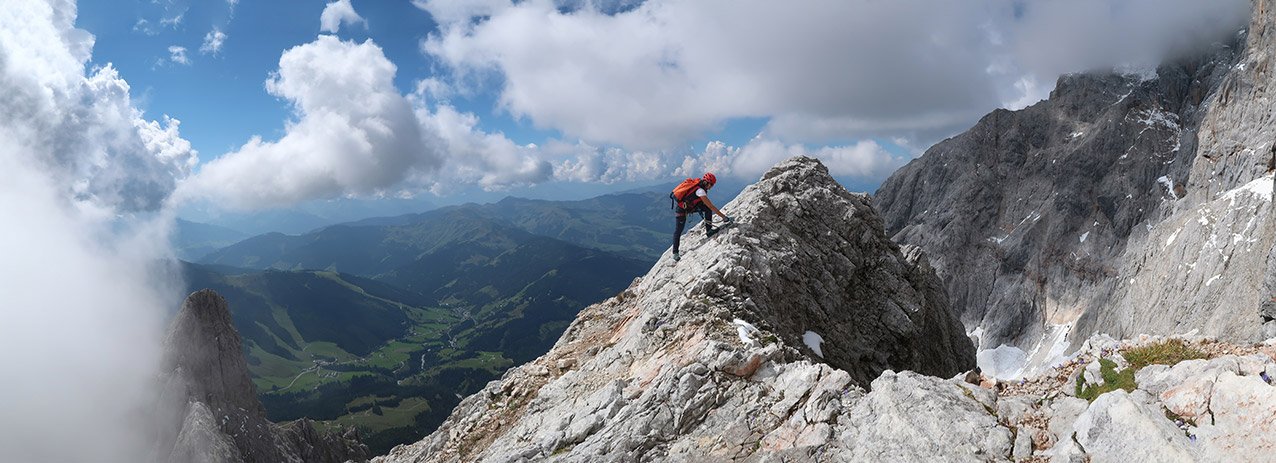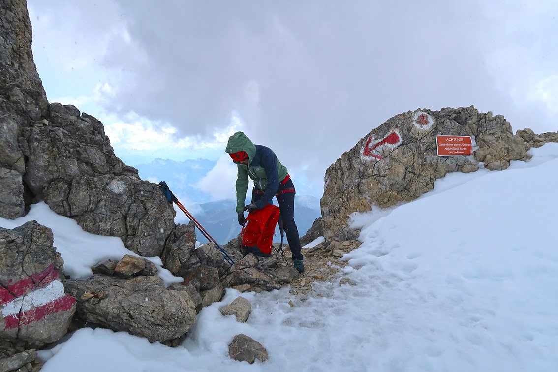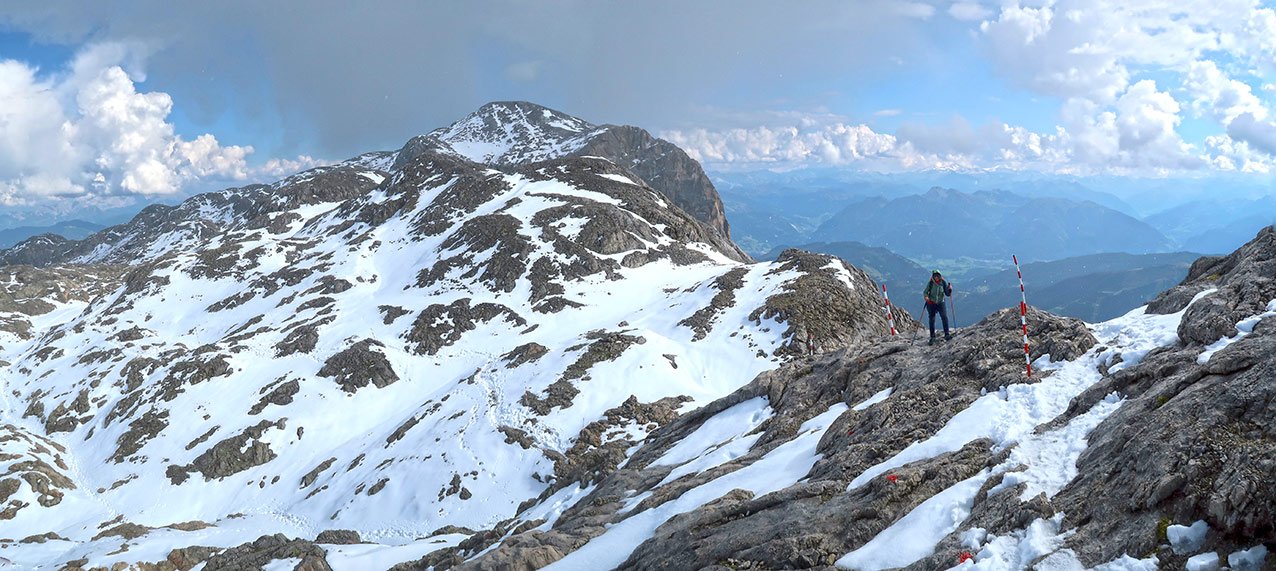 Vom Ausstieg rechts haltend in wenigen Minuten in die Birgkarscharte absteigen (von dort alternativ in 30 Min. zum Hochkönig-Gipfel).