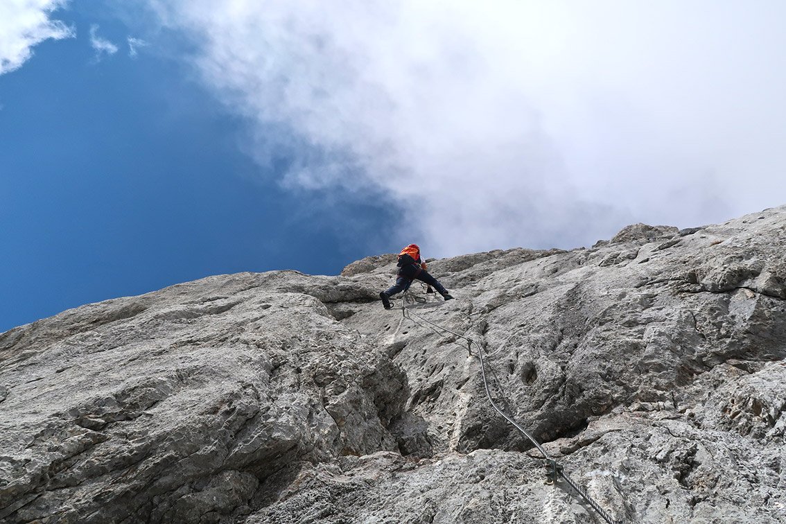 Achtung: Obwohl der Steig "nur" mit C/D bewertet ist, gehört er aufgrund seiner extremen Länge in großer Höhe zu den schwierigsten Sportklettersteigen der Ostalpen (Gesamtanspruch wie ein langer, knackiger D-Klettersteig!). Die Passagen sind zum Teil sehr ausgesetzt und meist nicht leichter als B/C ist (nach oben hin zunehmende Schwierigkeiten). Sehr gute Kondition und Erfahrung mit Klettersteigen in diesem Schwierigkeitsgrad sind unbedingt notwendig. Für Anfänger absolut ungeeignet.