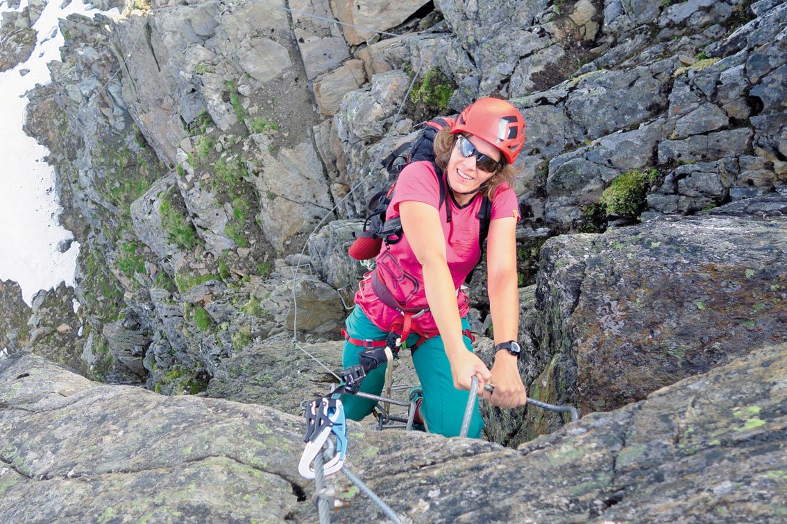 Komplette Klettersteigausrüstung und Helm - für schwächere und nicht so armkräftige Geher auf jeden Fall ein kurzes Sicherungsseil!