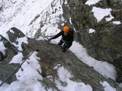 Teil 1: Zuerst über eine Rampe zum Beginn der Versicherungen queren, dort leicht (A) aufwärts bis zum sog. "Gaudi Wandl" (D), das mit einer längeren leicht überhängenden Passage den ersten Markstein darstellt. Danach über flacheres Gelände (B/C) und einer plattigen Kante (C, dann B) zum "Frühstücksplatzl" auf 2640m. Nun kurz ungesichert bis zum Beginn der Stahlseile, dann über Blockgelände (B) zu einer Querung (B und C), die einem zur Schlüsselstelle führt. Hier wartet eine überhängende Wandpassage an deren Ende man über eine Art Kante (D/E) steigt, danach kurz steil (D) weiter bis zum Ende der ersten Sektion. Dann ca. 250 m, anfangs sehr ausgesetzt, den Markierungen zum Beginn des zweiten Teils folgen.
