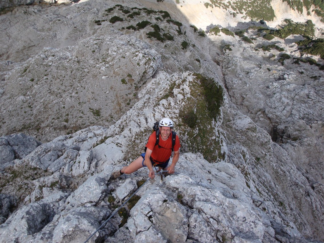Komplette Klettersteigausrüstung und Helm, für schwächere Geher ein Sicherungsseil.