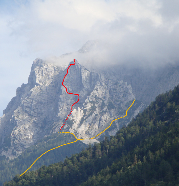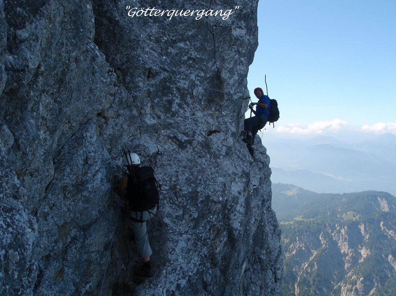 Vom Einstieg über gestuftes Gelände (A) zu einer steileren Passage rechts einer Rinne (B), von der man über Schrofen (A/B und A) auf das erste Schuttband gelangt. Links geht man zum Beginn des zweiten Vorbaues, dieser ist unten steiler (B), wird aber vor der sog. schwarzen Wand wieder etwas flacher (A/B). Sehr steil (C/D und D) steigt man rechts der schwarzen Wand empor und gelangt leicht rechts haltend, immer noch sehr luftig (C und C/D) in gestuftes Gelände. Dort links hinauf (B u. A) zu Schuttband. Gehend erreicht man den nächsten Abschnitt, dieser führt teilweise steil (C) hinauf auf den Grat (Absatz). Über einen Block (B) erreicht man einen steilen Kamin (C) an dessen Ende ein sehr steiler, ausgesetzter Pfeiler (C/D) überwunden werden muss. Etwas leichter (C) erreicht man ein kleines Band (kurz gehen). Eine Wandstelle (B/C) führt nach links zu einer kurzen Steilstufe (C), nach dieser erreicht man ein Querband (B und A). Zu Beginn leicht (A) und kurz ab- und aufsteigend (B) kommt man in den sog. Götterquergang. Waagrecht (C), dann aber leicht aufsteigend (C), erreicht man das letzte, sehr ausgesetzte Steilstück (C/D) vor dem Gipfelgrat (A) und schlussendlich den Gipfel.