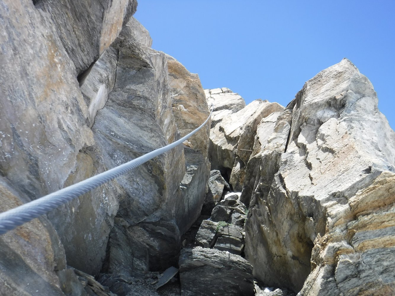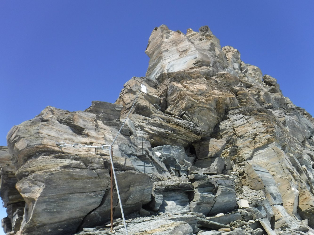 Die ersten 30 Meter der ca. 100 Hm auf die Cima di Furggen sind mit B/C die schwierigsten, danach folgt man dem Grat, vor der alten Station wird der Grat noch einmal steiler (B) und man erreicht das Ende auf dem Dach der alten Bergstation.