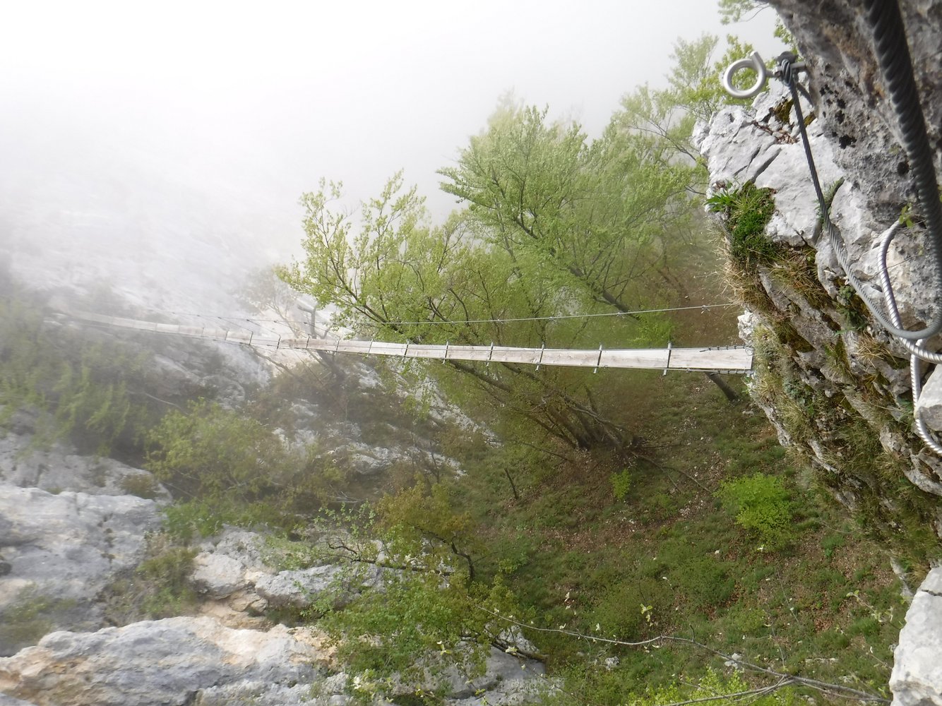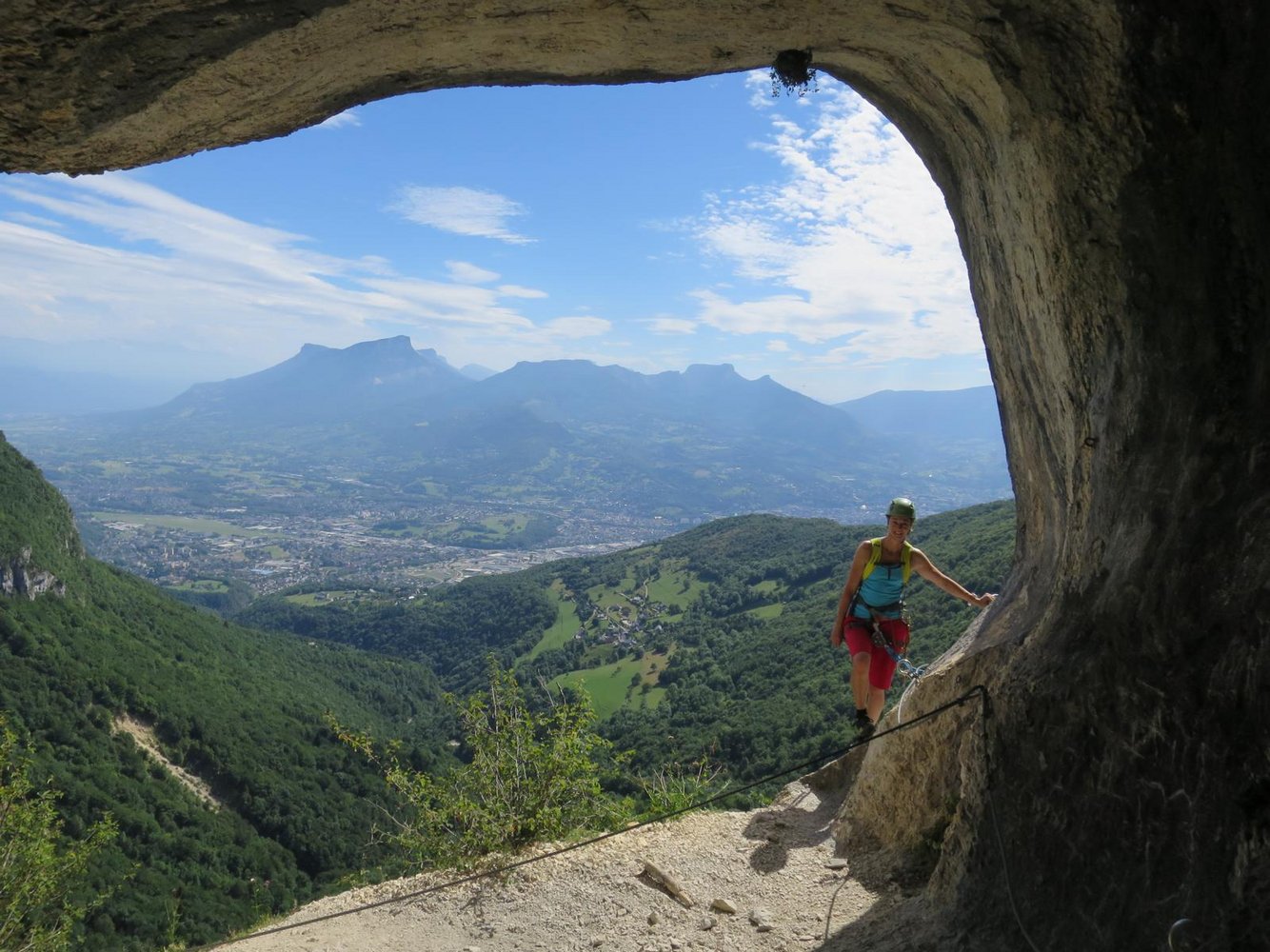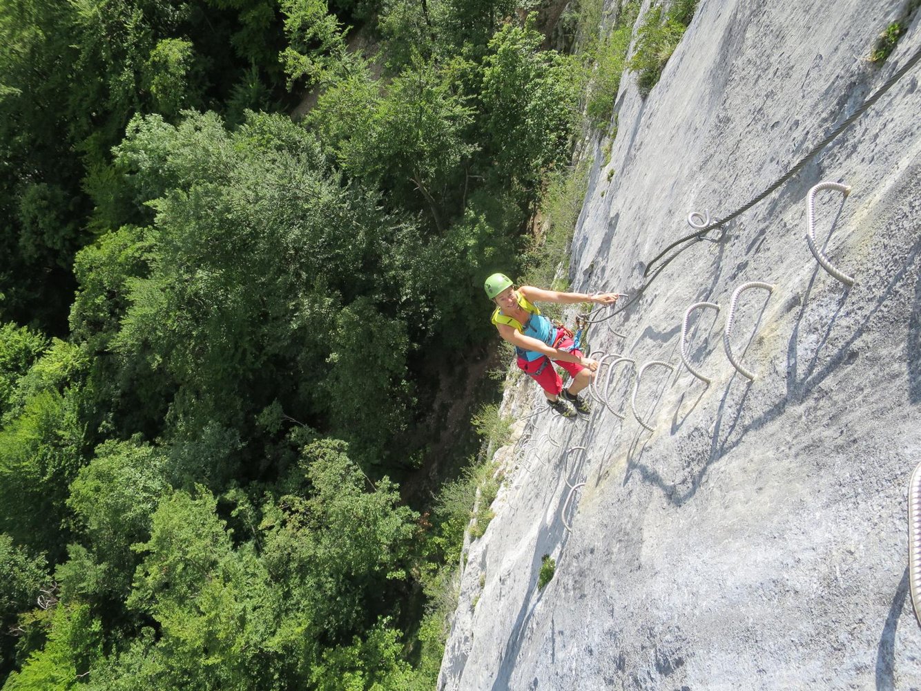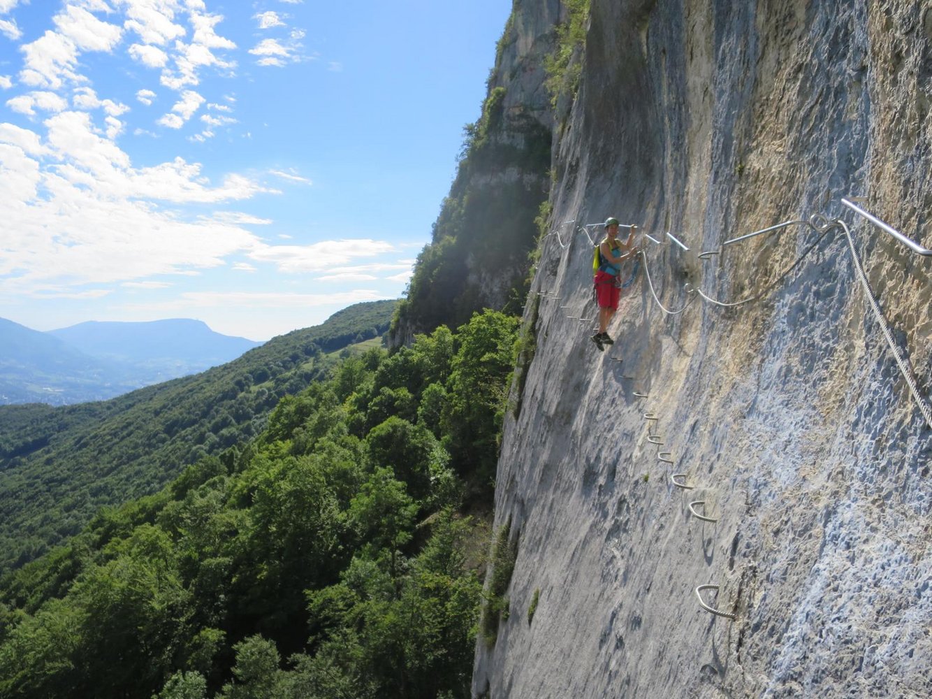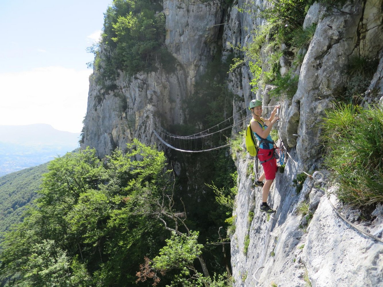 Schöner und 450 Meter langer Klettersteig auf den Roche de Charvetan bei dem lange Querungen dominieren. Im oberen Teil bei der Brücke sind zwei Varianten möglich.