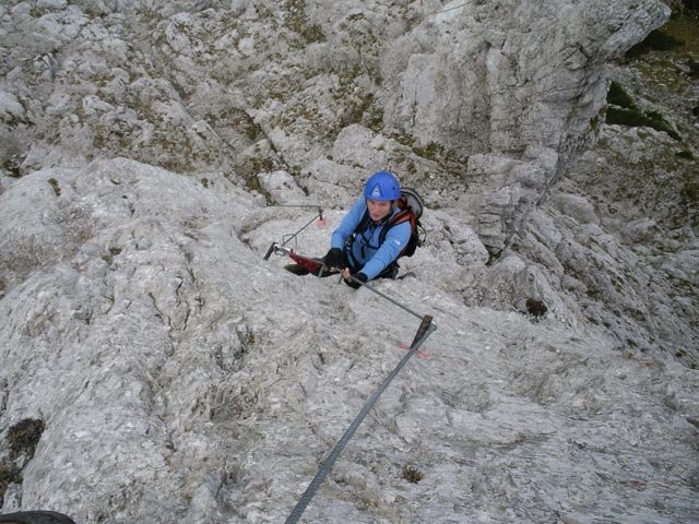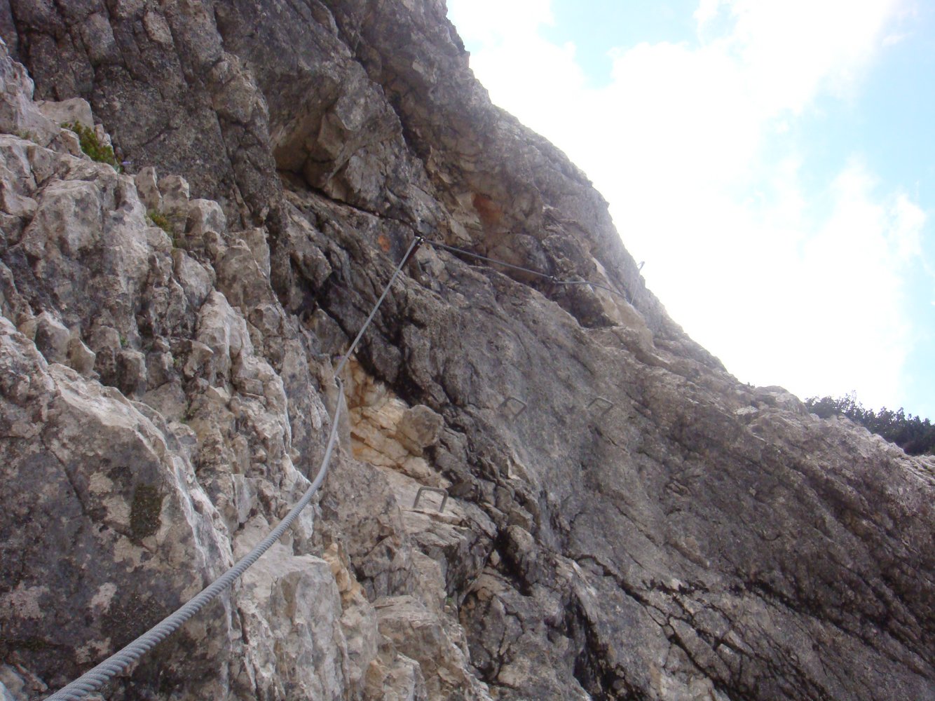 Vom Einstieg durch einen Kamin (B) zu einer Platte (C). Leicht (A) nach rechts zu einem mit Klammern versicherten Überhang (C) queren. Auf einem Band (A) zu einer Felsstufe (B). Nach einer Platte (C/D) führt ein erdiger Pfad (meist A, eine Stelle B/C) durch die Latschen. Es folgt eine Querung nach rechts (A). Über eine Platte (B) und anschließend wieder erdig (A/B) zu einer Verschneidung (B/C). Nach kurzer Rechtsquerung geht es direkt an der Kante (meist A/B, eine Stelle B/C) eines Pfeilers empor. Kurz abklettern (A) und durch erdiges Gelände (A) zu einem Band (A). Es folgt eine Querung nach rechts (A). Unter einem Überhang (C) geht es an eine Kante. Durch einen Kamin (B/C) auf den flachen Grat (A).