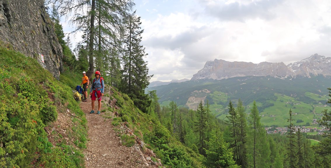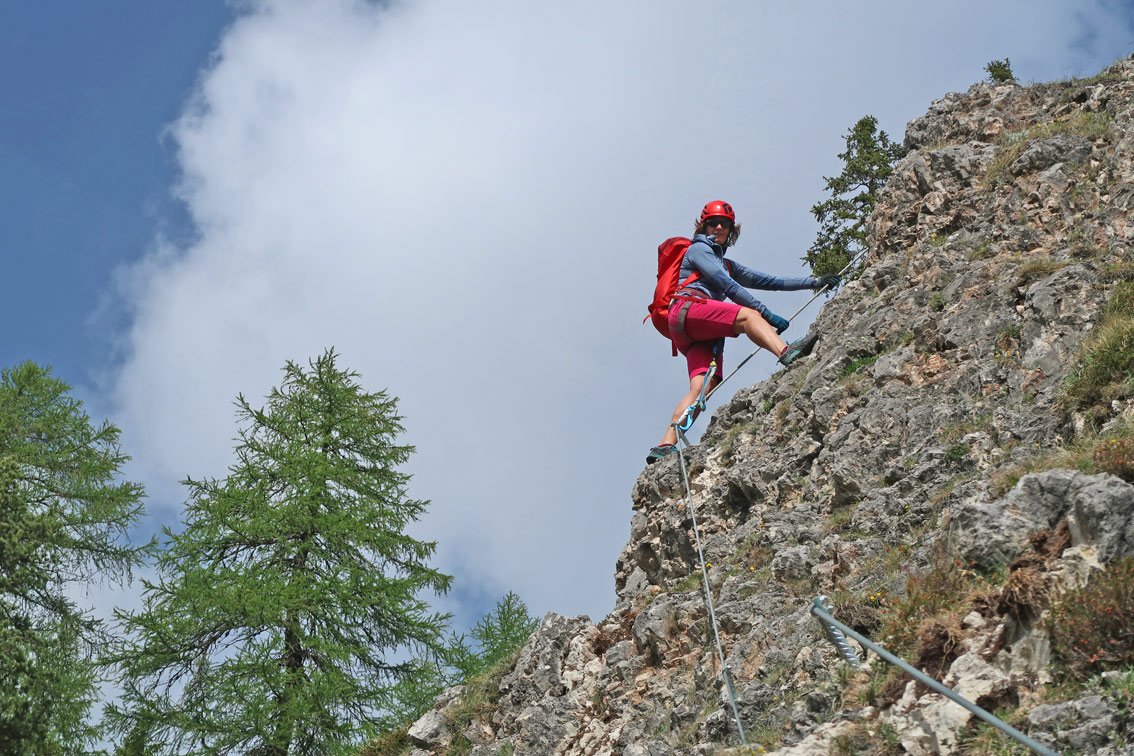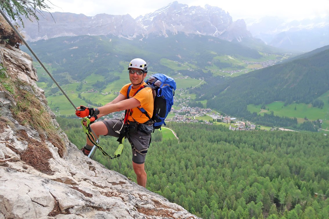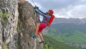 Die Ferrata Les Cordes ist ein einfacher Klettersteig der vor allem mit den Reizen der umliegenden Landschaft punktet. Nach der etwas steileren Einstiegswand hat man ab der Mitte genug Zeit die Blicke auf die fantastischen Felsspitzen der Dolomiten schweifen zu lassen – Heiligenkreuzkofel, Tofana und Conturines sind zum Greifen nah. Wer die klettertechnische Herausforderung an vertikalen Felsen erwartet, wird enttäuscht sein, wer aber einen einfachen Klettersteig - inmitten toller Berglandschaft - sucht, ist an dem 400 Meter langen Stahlseil der Ferrata Les Cordes genau richtig!