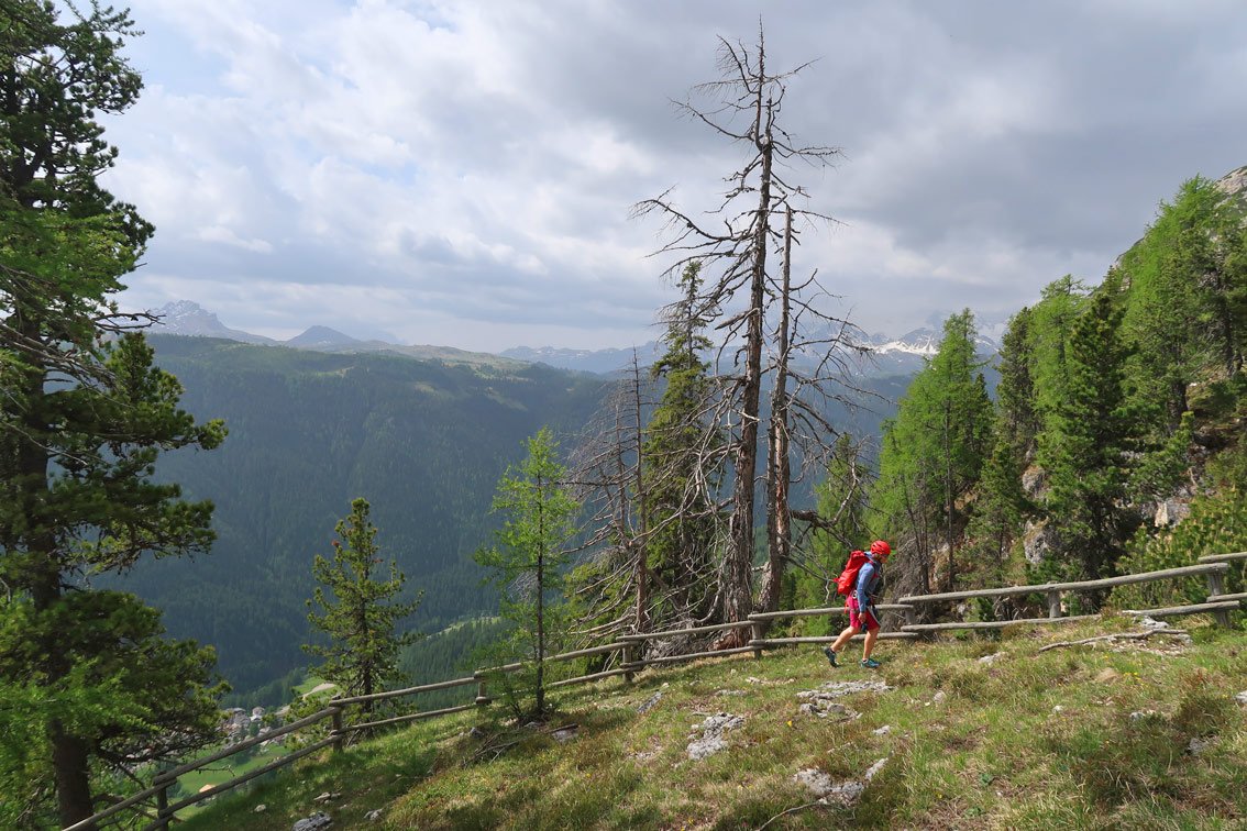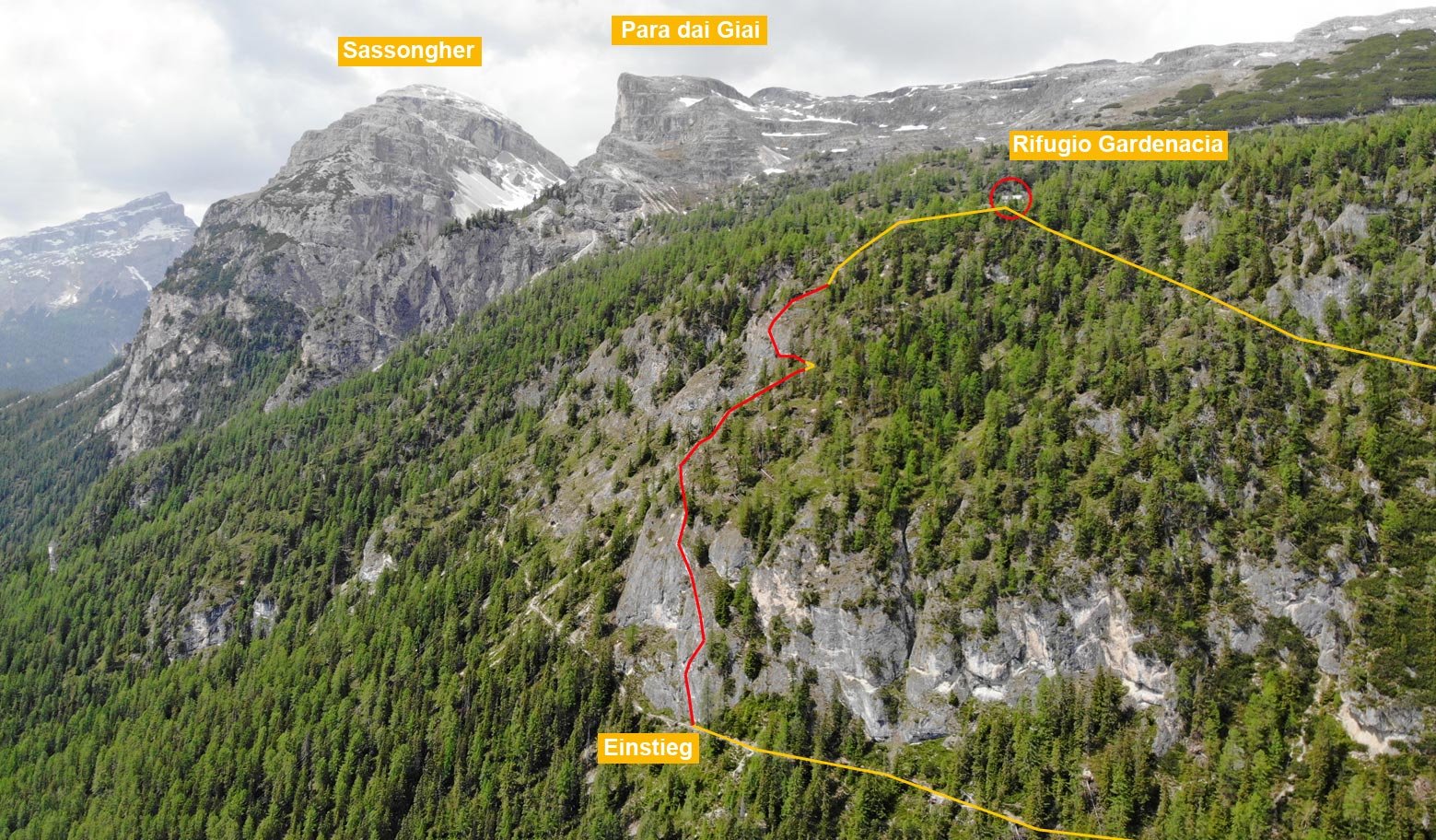 Vom Ende des Klettersteiges links aufwärts bis zum Rifugio Gardenacia (ca. 10 Minuten). Vom Rifugio Gardenacia am besten auf dem Weg Nr. 5 zurück zur Bergstation (wer vom Tal aufgestiegen ist, weiter ins Tal).
