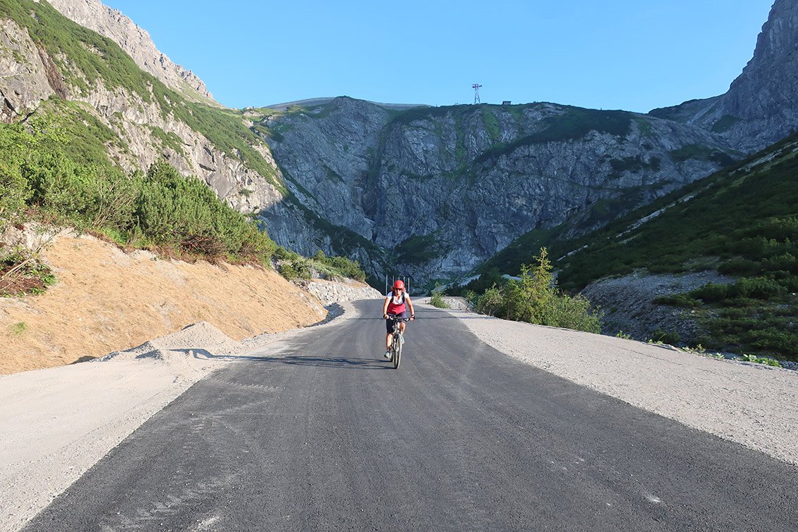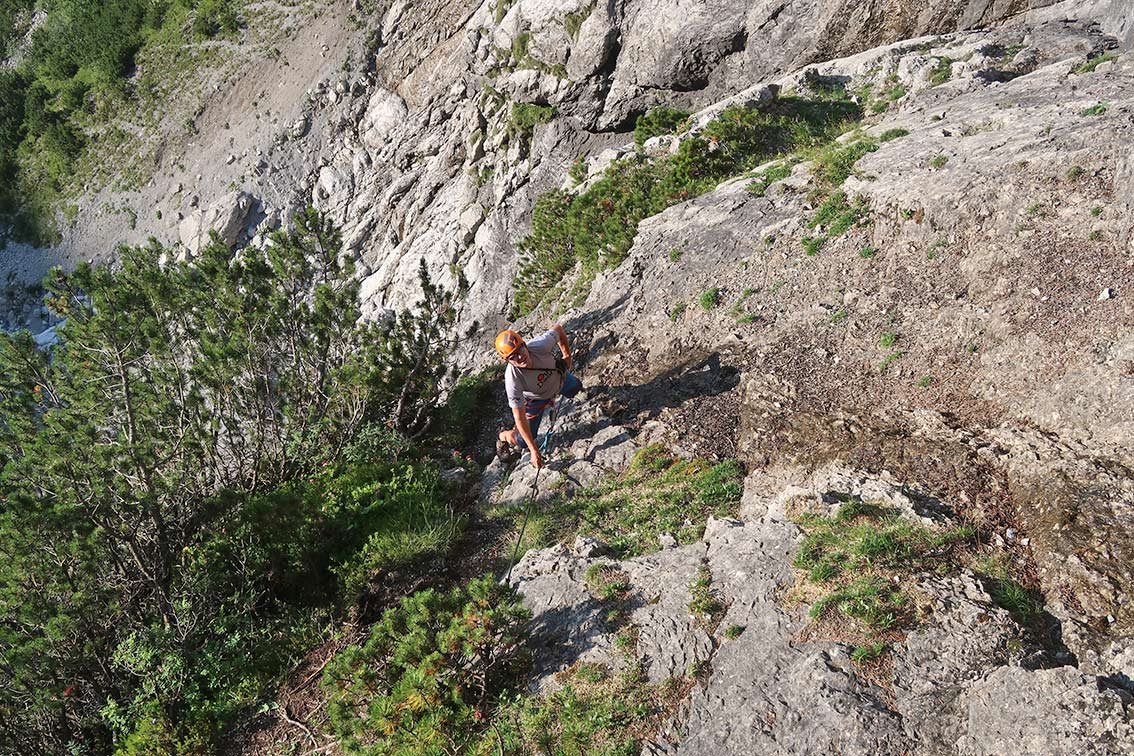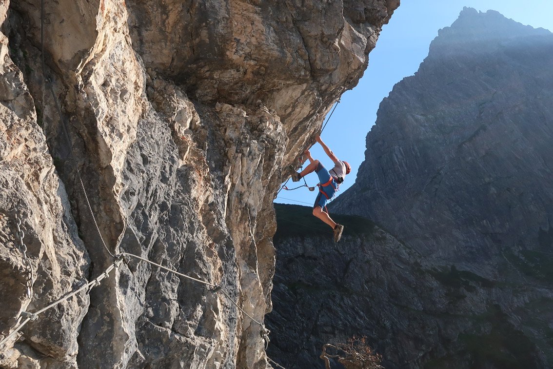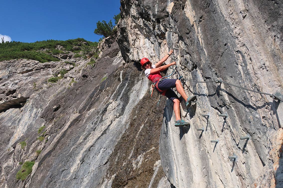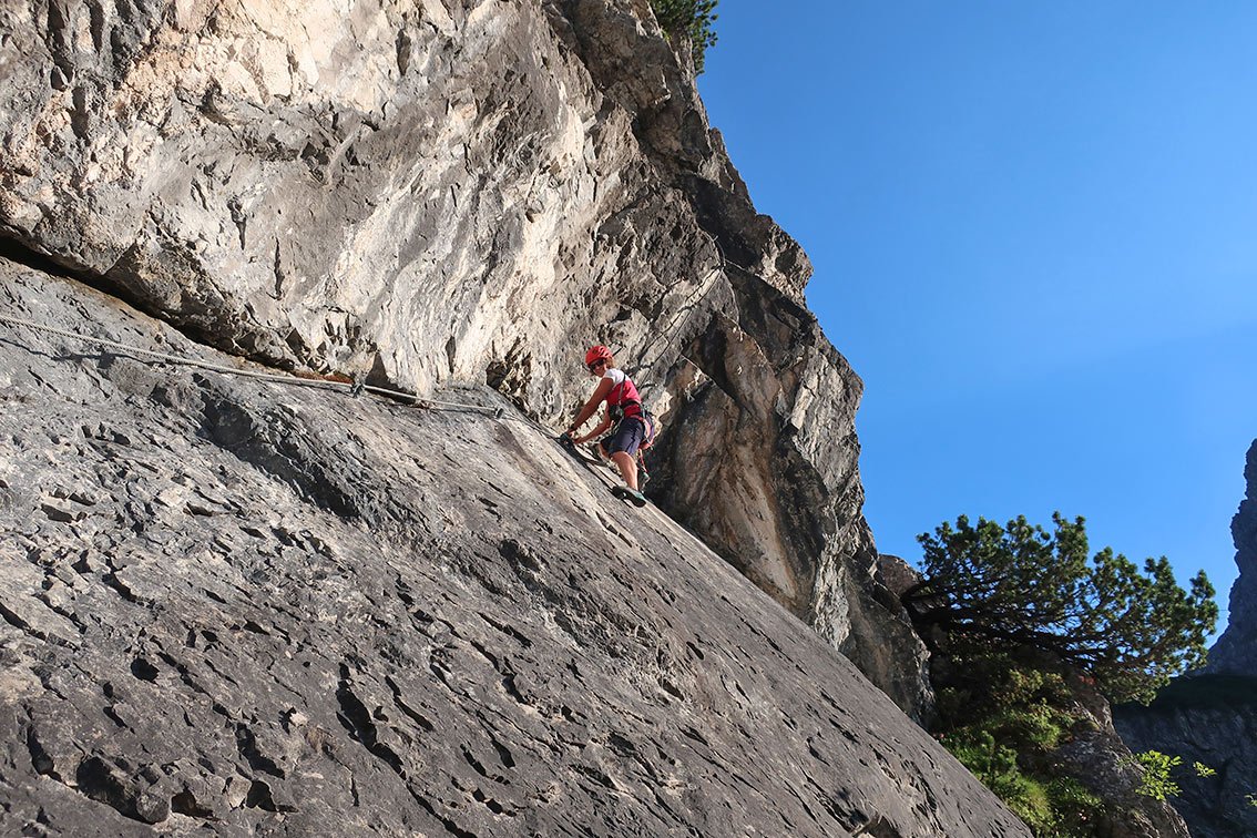 Komplette Klettersteigausrüstung und Helm; für schwächere Geher ein Sicherungsseil.