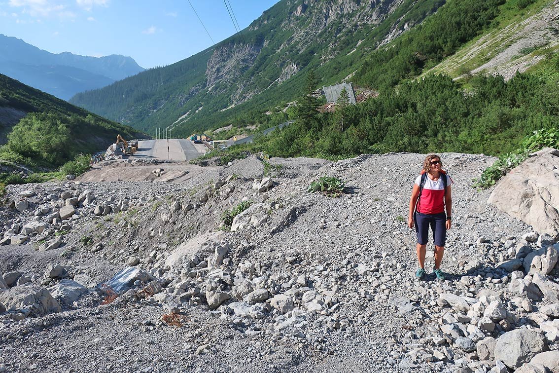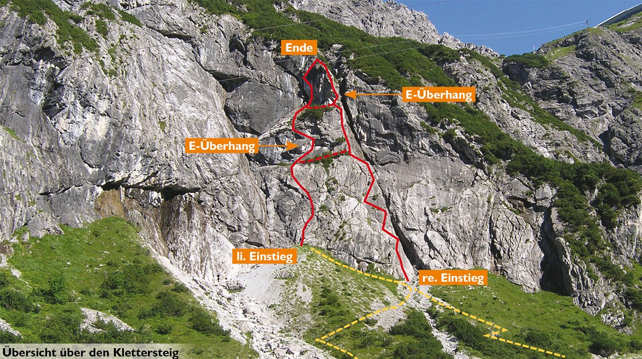 Vom Parkplatz folgt man kurz dem Bach und steigt dann linkshaltend über eine Schutthalde zum Einstieg bei einer schon vom Parkplatz aus sichtbaren weißen Tafel auf. Je nach gewählter Route beginnen die Versicherungen links oder rechts neben der großen Informationstafel.