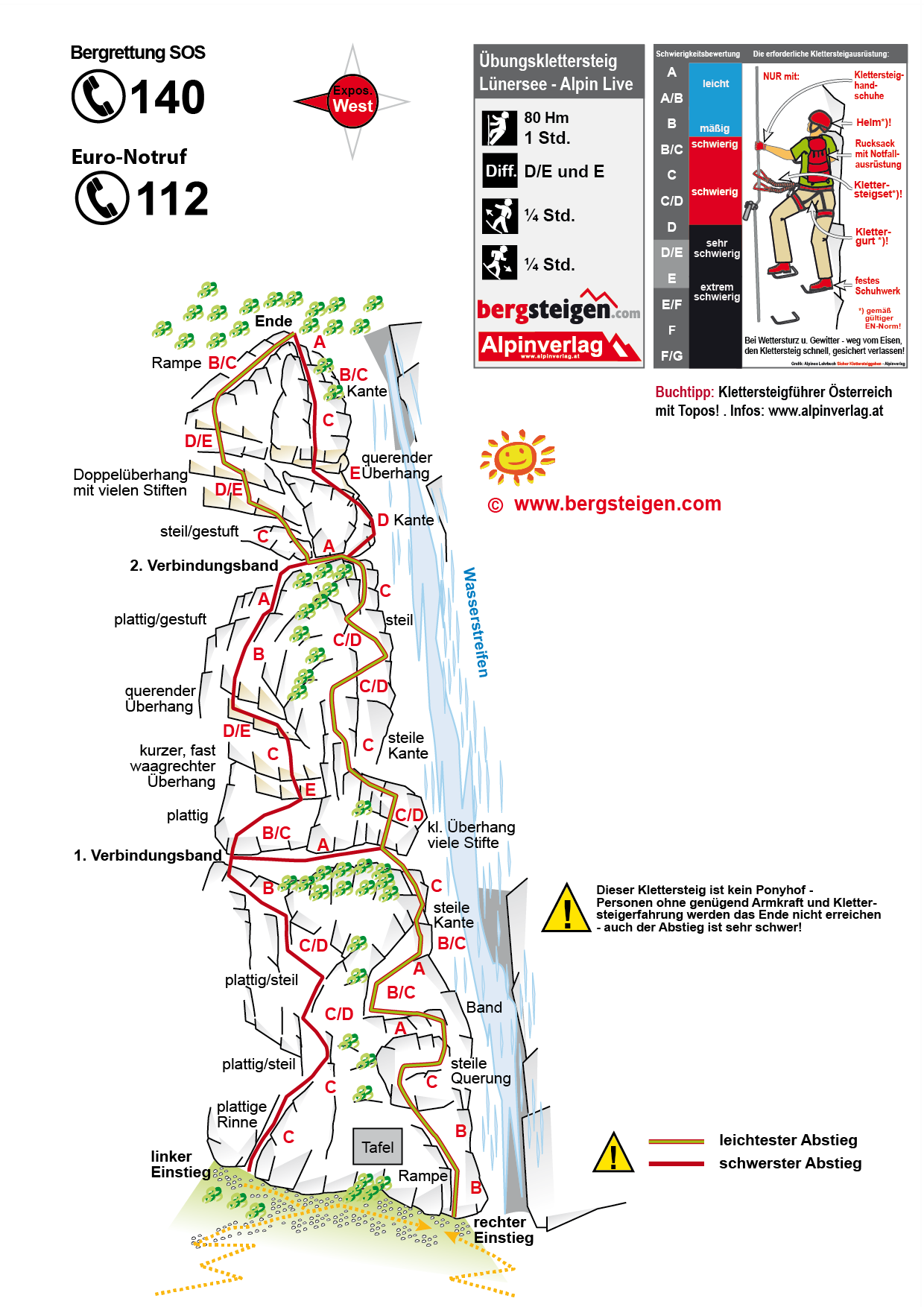 Extrem schwerer Sportklettersteig, Stellen E, oft Stellen mit D, selten leichter. In Kombination mit einem Besuch der Douglashütte oder des rechts vom Klettersteig gelegenen „Anfängerklettergartens“ ein lohnendes Vorhaben. Wegen des kurzen Zustieges auch gut mit anderen Klettersteigen in der Nähe (z.B. Saulakopf-Klettersteig oder Francesco Tarmann-Klettersteig) zu kombinieren.