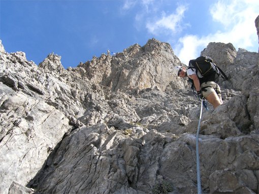 2. Teil (Kleine Gamswiesenspitze - 110 hm): Von der Gamsscharte auf einen Felskopf (zuerst B, dann B/C). Über die steile Platte (B/C) geht es auf den Zackengrat. Nachdem der erste Gipfel (A/B) erklommen ist, steigt man in eine kleine Scharte ab (B/C). Leicht rechts vom Grat (B) wird der Ausstieg auf der Kleinen Gamswiesenspitze erreicht.