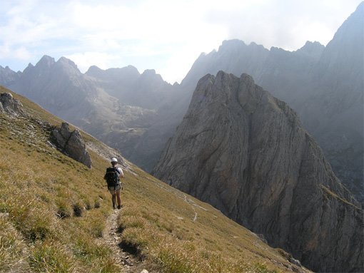 Vom Ausstieg auf ausgetretenem Pfad ein Stück aufsteigen (evtl. in wenigen Minuten zum Gipfel) und anschließend rechts in Serpentinen hinunter in die Gamsscharte. Hier befindet sich ein Notabstieg nach rechts.