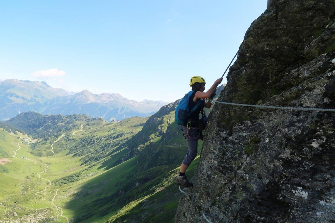 Nur wenige kurze Passagen C/D, meist um C und leichter. Für Leute mit guter Ausdauer geht der Madrisella-Klettersteig auch als C-Ferrata durch.